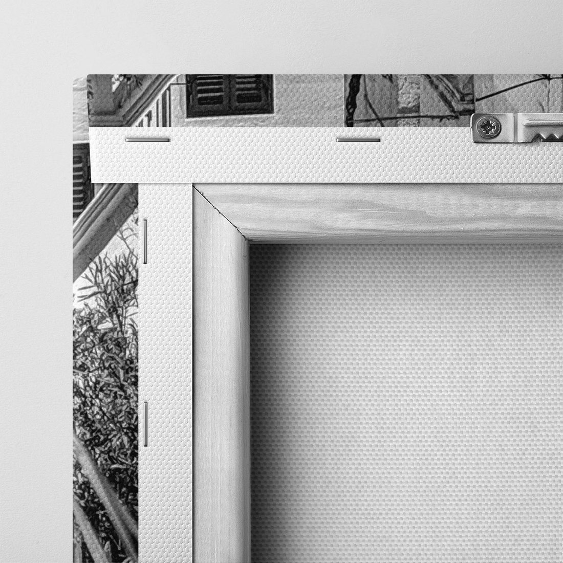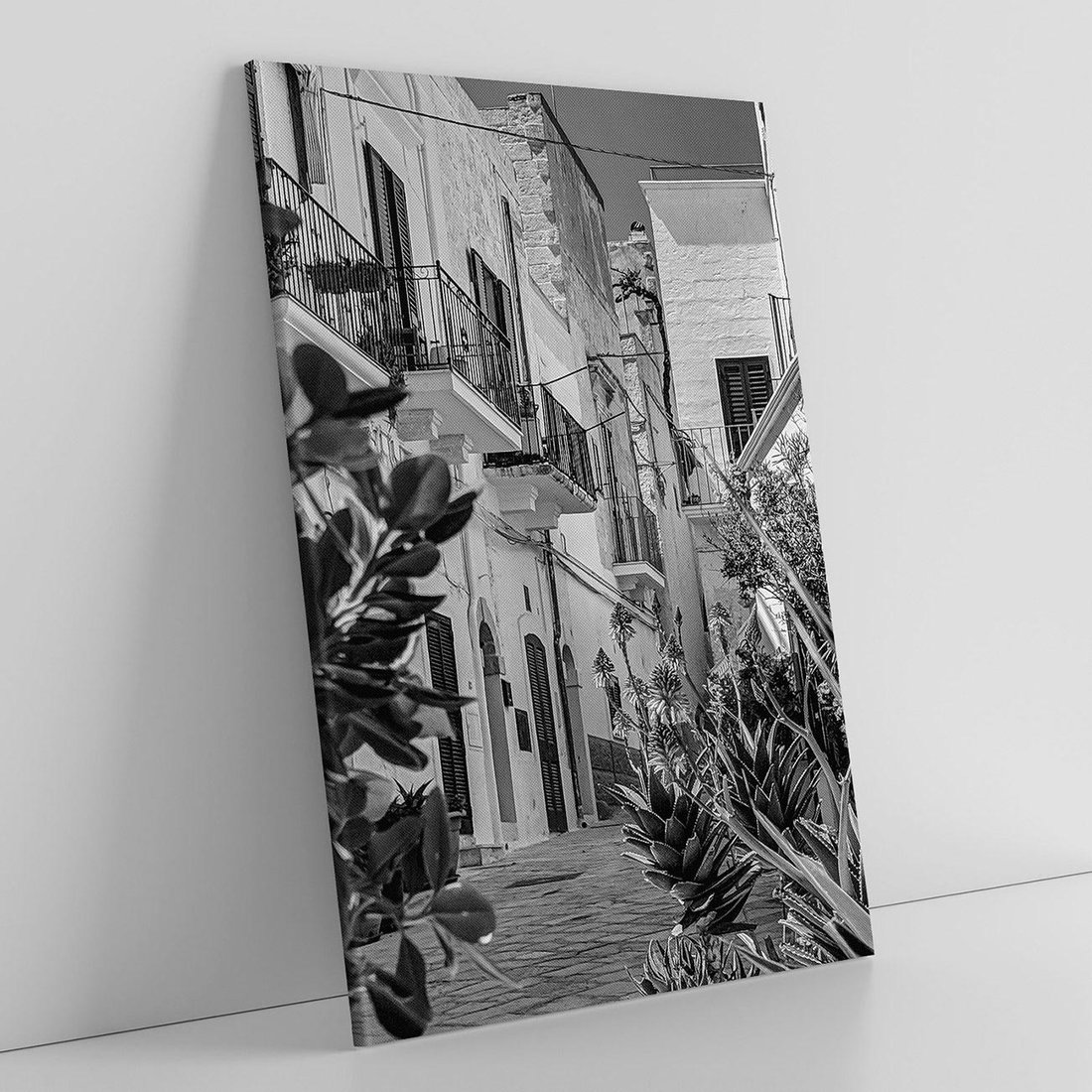 To czarno-białe zdjęcie przedstawia urokliwą uliczkę w nadmorskim mieście na południu Europy, być może we Włoszech lub Grecji. Ulica wydaje się być spokojnym zakątkiem, gdzie kamienne budynki sąsiadują ze sobą, tworząc malowniczą scenerię. Zdjęcie oddaje urok historycznej architektury i atmosferę tego miejsca, a brak kolorów skupia uwagę na detalach i strukturach budynków oraz uliczki. To idealna dekoracja dla miłośników kultury śródziemnomorskiej i romantycznych krajobrazów.