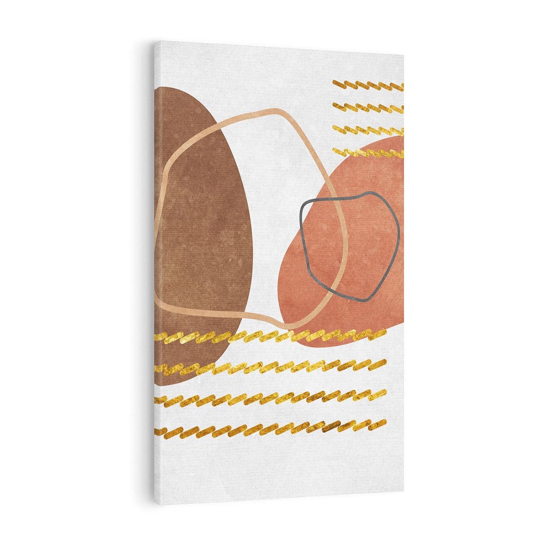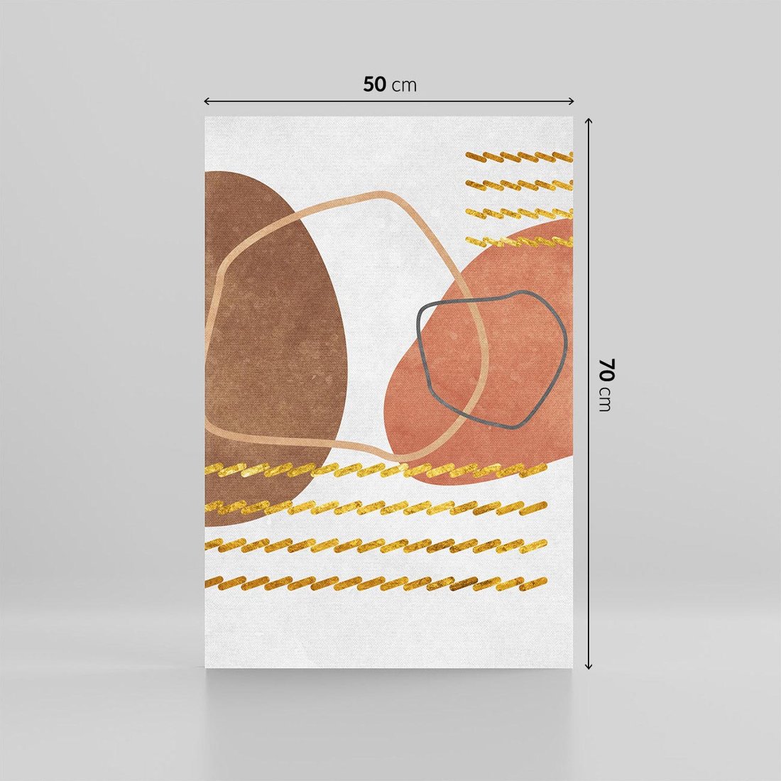 Zapraszamy do odkrycia magicznego obrazu w stylu boho, gdzie abstrakcyjne rozlane plamy ożywiają płótno. Złote zygzaki dodają mu wyjątkowej elegancji. Ciepłe odcienie rudości i brązów emanują harmonią natury. To dzieło sztuki stworzone dla miłośników oryginalnych dekoracji, pragnących wprowadzić artystyczną duszę do swoich wnętrz.