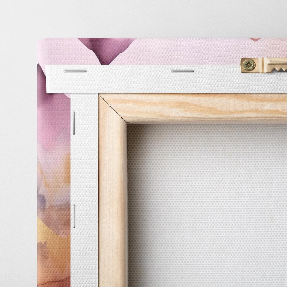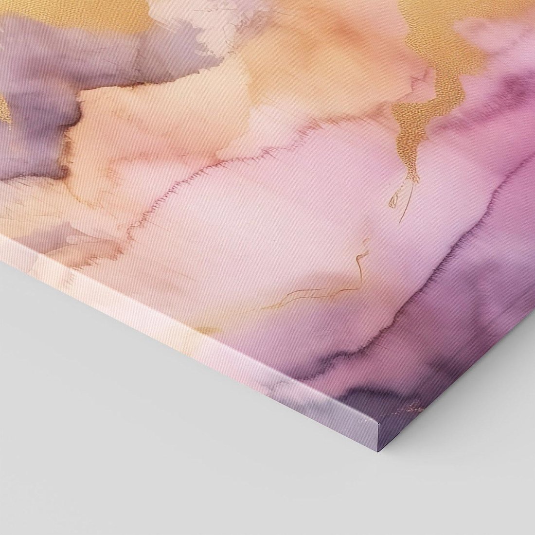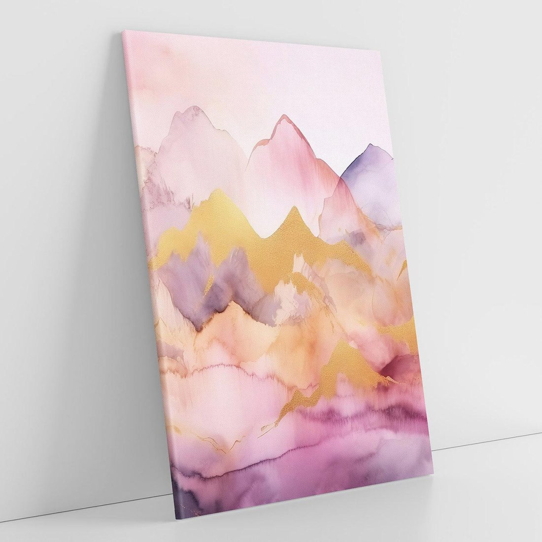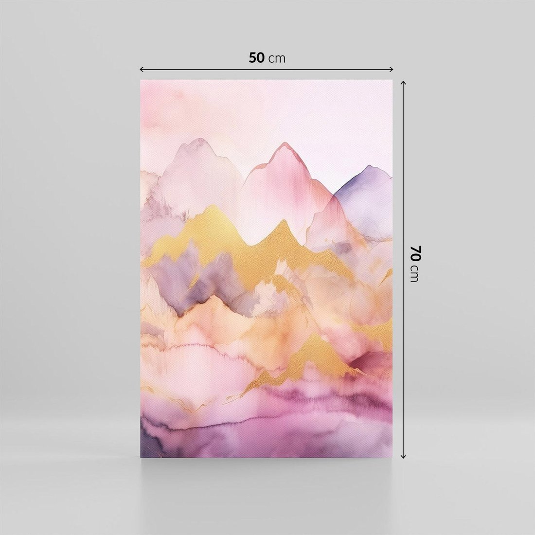 Ten obraz przedstawia pastelowe, różowe góry z akwarelowymi detalami w złotych tonach. Sztuka nowoczesna emanuje spokojem i subtelnością, nadając wnętrzom salonu lub sypialni unikalny urok. Odcienie różu i złota tworzą harmonijną kompozycję, która wzbogaca każdą przestrzeń.