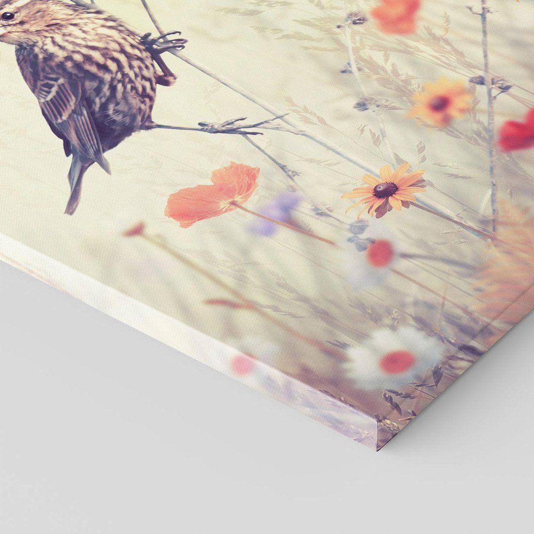 Przenieś się w spokojny poranek na łące dzięki temu uroczemu obrazowi przedstawiającemu ptaka. Zielona trawa, delikatne kwiaty i świeże powietrze tworzą harmonijną aurę. Ta kompozycja dodaje bliskości z naturą i witalności, idealna dla miłośników spokojnych poranków i pragnących wprowadzić świeżość do swojego wnętrza.