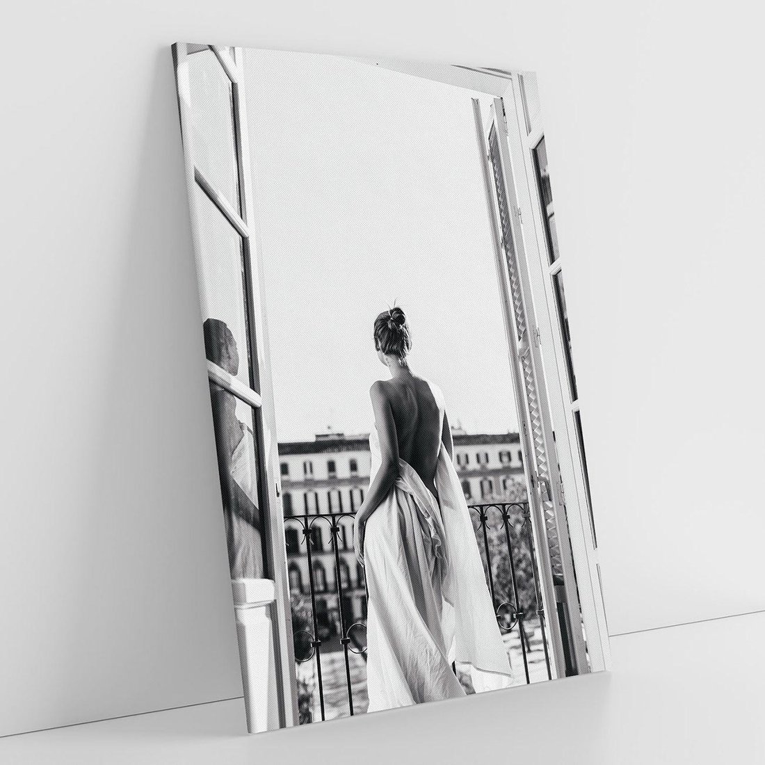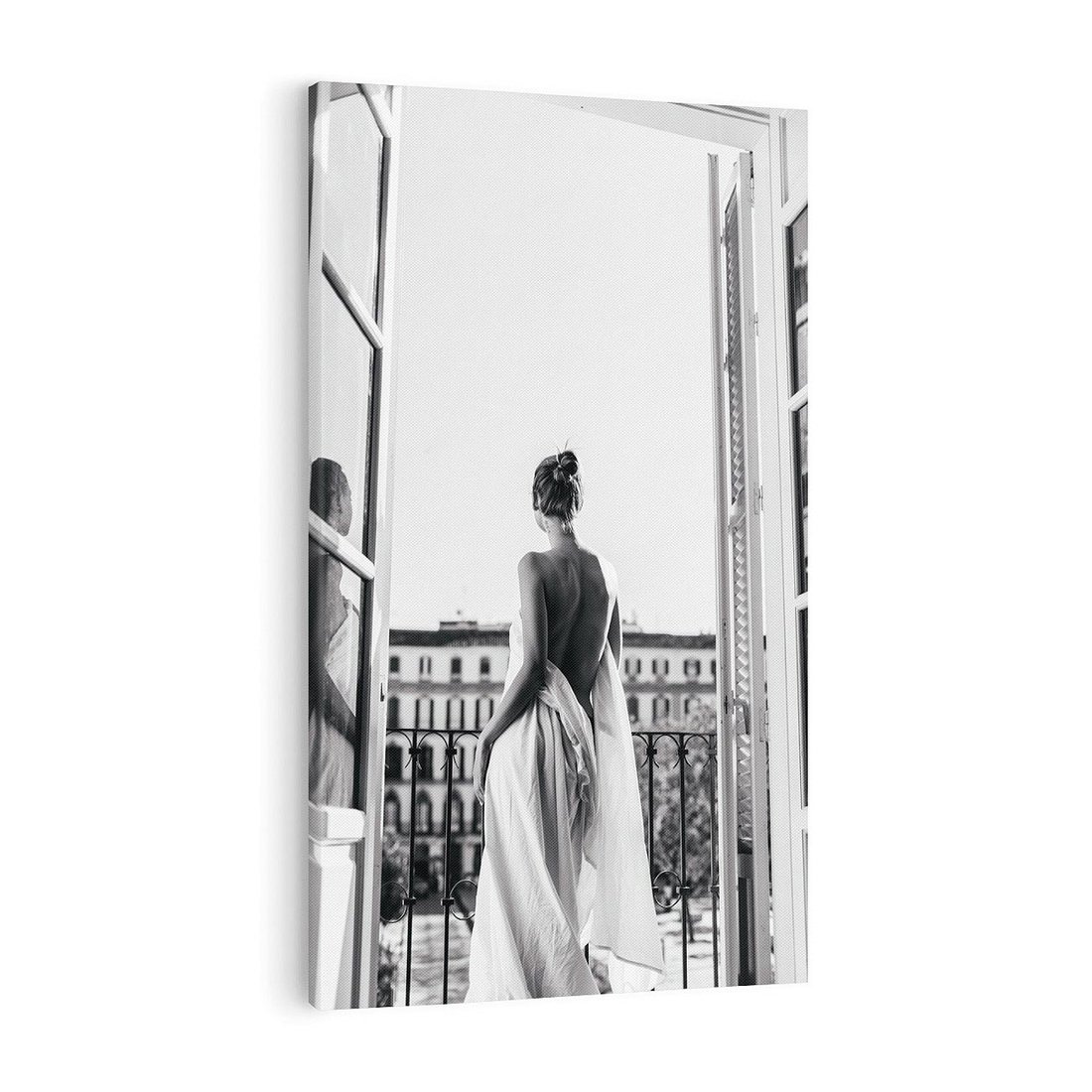 Obraz na płótnie 50x70 - Poranki w Paryżu - czarno białe zdjęcie, kobieta w prześcieradle na balkonie