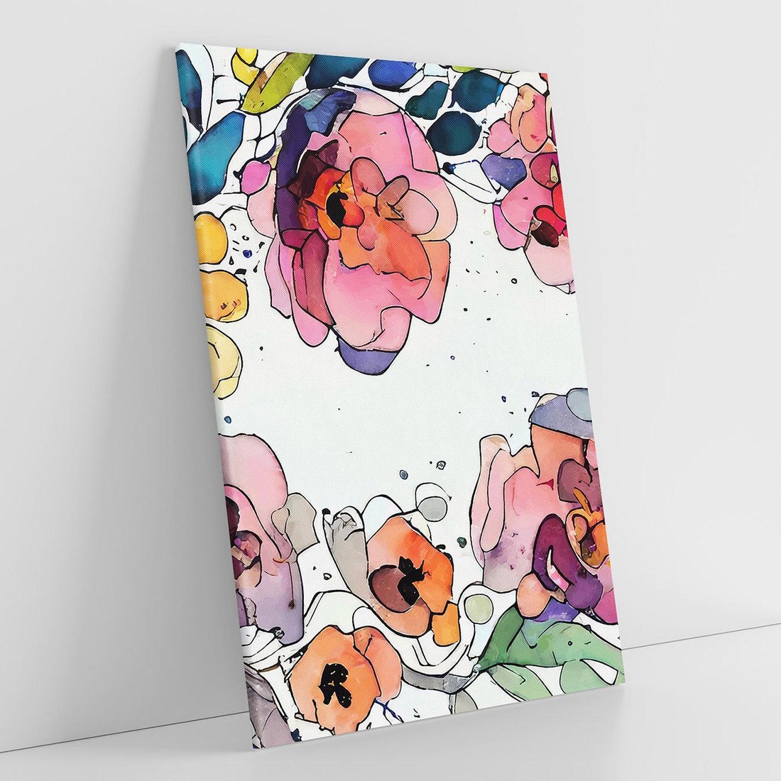 Ten obraz przypomina witrażowe kompozycje, gdzie akwarelowe kwiaty ożywają w intensywnych kolorach. Czarne kontury wydobywają ich piękno i nadają im wyrazistość. To połączenie kunsztu witrażowego z subtelnością kwiatowych motywów tworzy niepowtarzalną wizję natury.
