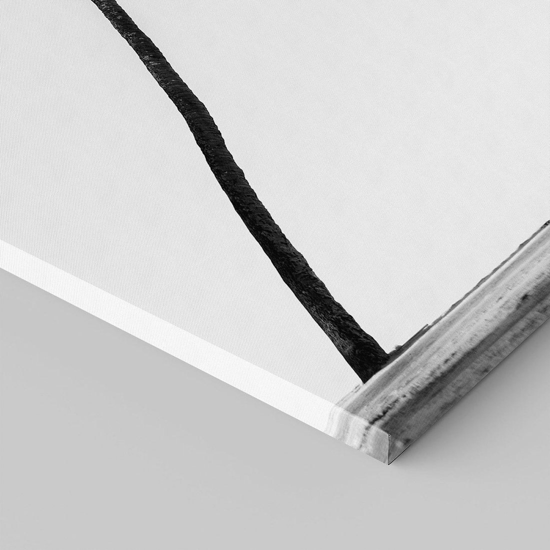 Ta czarno-biała fotografia przedstawia malowniczy widok dwóch samotnych palm na plaży, nad oceanem. Fotografia oddaje spokój i urok tej scenerii, a brak koloru dodaje jej klasycznego i nostalicznego charakteru. To zdjęcie może przypominać o spokoju i pięknie przyrody, a jednocześnie wywoływać uczucie samotności i kontemplacji. Jest to doskonała dekoracja dla tych, którzy cenią sobie minimalistyczny styl i chcą przenieść atmosferę nadmorskiej scenerii do swojego wnętrza.