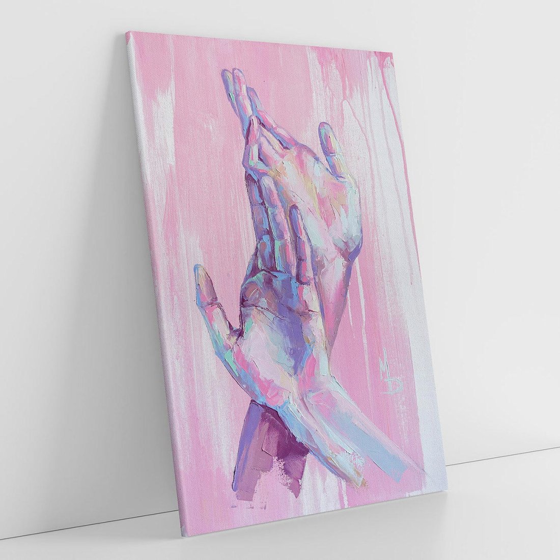 Ten nowoczesny obraz olejny w pastelowych kolorach prezentuje splecione dłonie jako główny motyw. Delikatne odcienie pasteli nadają mu subtelności i spokoju, tworząc jednocześnie abstrakcyjną i znaczącą kompozycję. To dzieło sztuki emanuje harmonią i jednością, symbolizującą współpracę, miłość lub zrozumienie między ludźmi. Idealnie pasuje do wnętrz o nowoczesnym designie, które cenią sobie sztukę jako wyraz emocji i relacji.