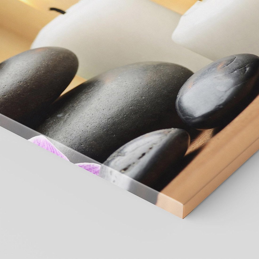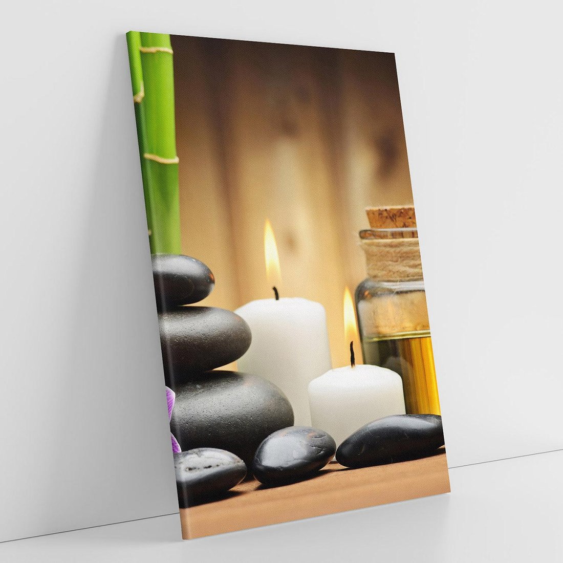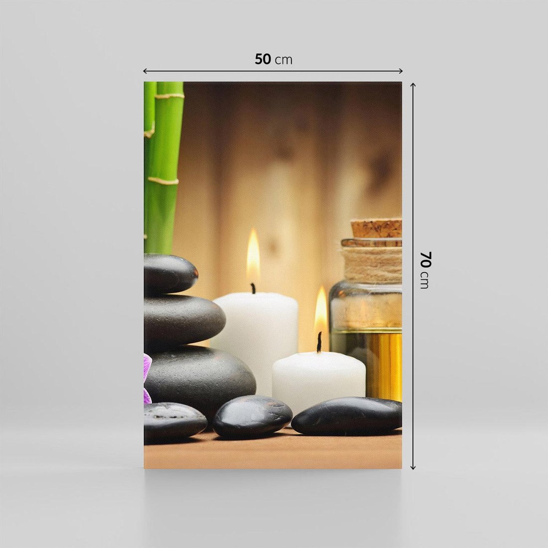 Przenieś się do spokojnego zakątka SPA dzięki temu ujmującemu obrazowi na płótnie. Bambus, kamienie i delikatne kwiaty tworzą atmosferę harmonii i ukojenia. Dodaj naturalnego piękna i siły natury do swojego wnętrz
