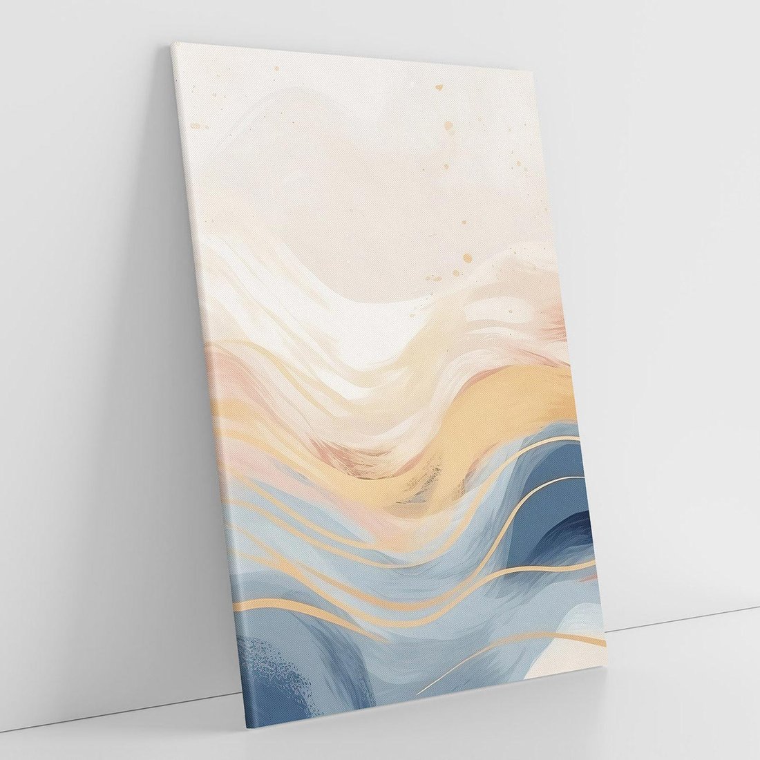 Odkryj elegancję w subtelnych abstrakcyjnych falach na płótnie. Gładkie linie tworzą klasyczne kształty, a delikatne pastelowe kolory dodają przyjemnej atmosfery, idealnej do ozdobienia Twojego domu.