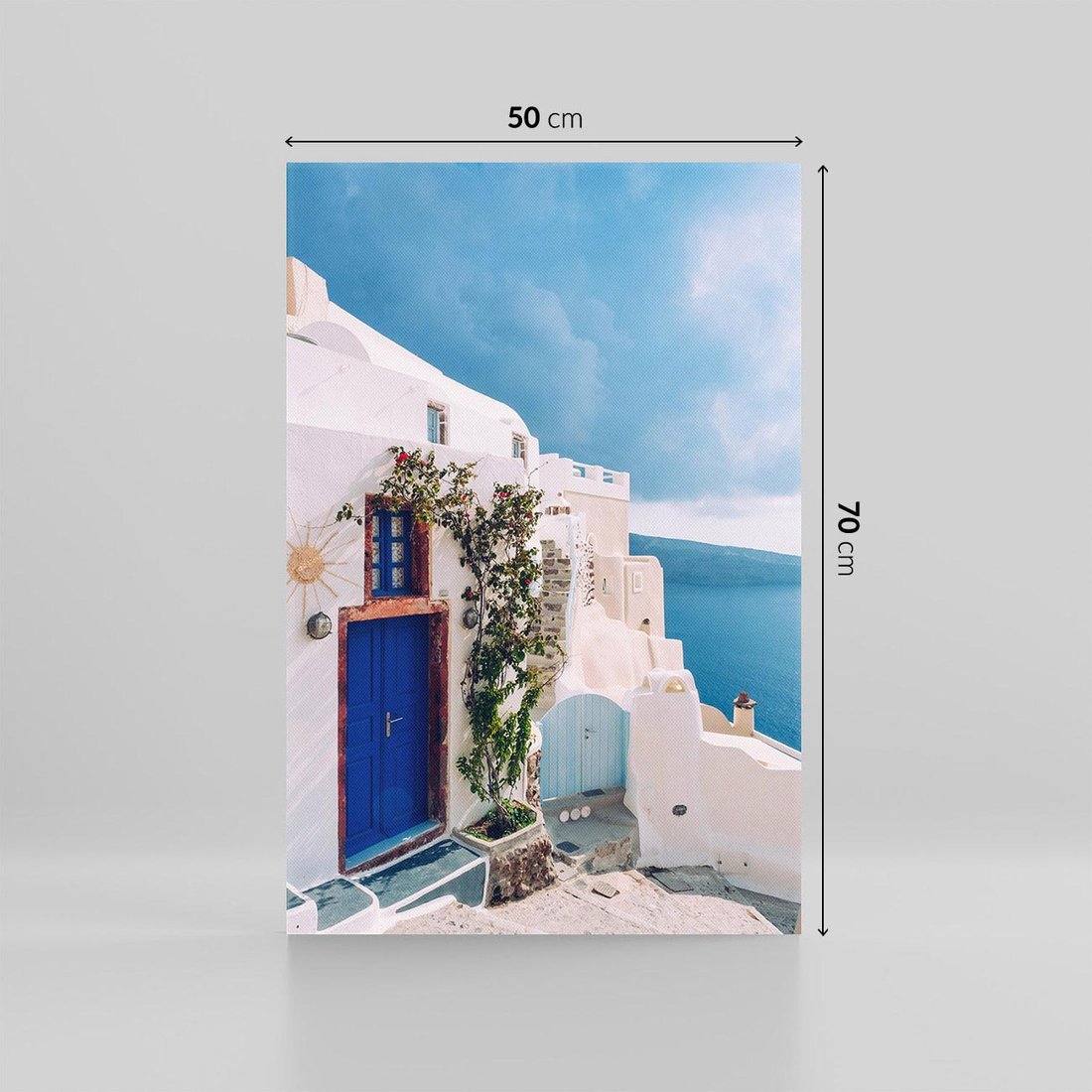 Poczuj urok greckiej wyspy Santorini za pomocą obrazu. Przenieś się w atmosferę białych domków i błękitu morza, dodając do swojego wnętrza nutkę śródziemnomorskiego stylu.