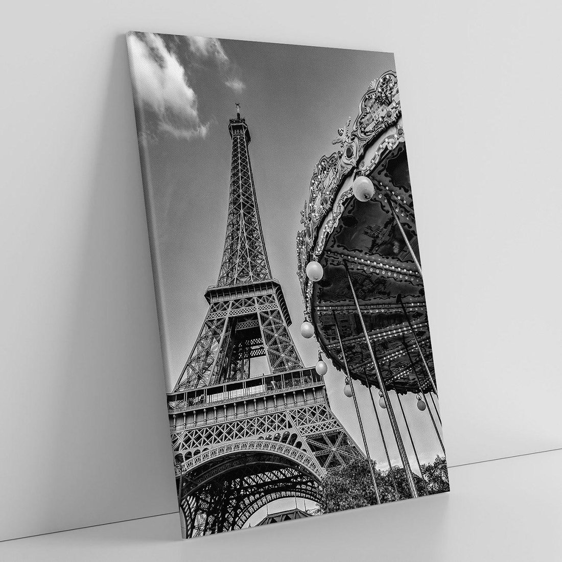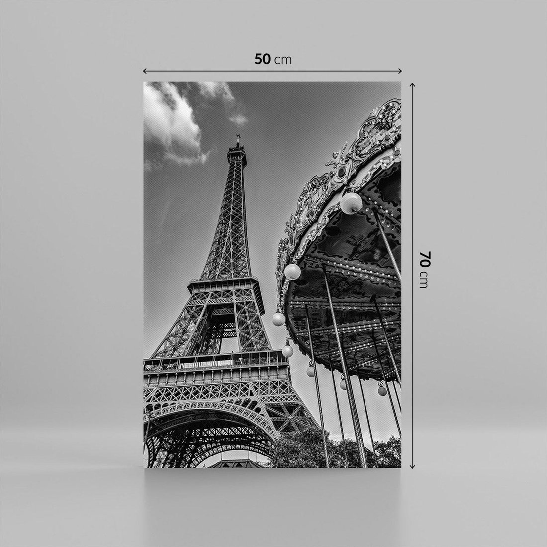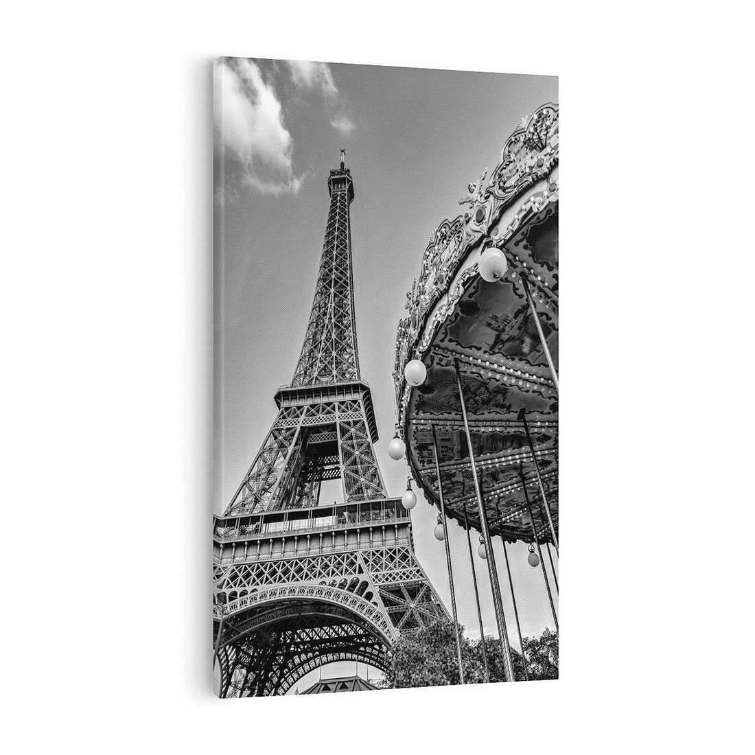 To czarno-białe zdjęcie przedstawia Wieżę Eiffla w Paryżu w towarzystwie urokliwej karuzeli. To ikoniczna scena z francuskiej stolicy, która łączy w sobie zarówno nowoczesność symbolizowaną przez wieżę, jak i klasyczną, nostalgiczną atmosferę karuzeli. To zdjęcie przenosi nas do magicznego świata Paryża, gdzie historia i nowoczesność spotykają się w niezwykły sposób. Jest to doskonała dekoracja dla tych, którzy pragną poczuć magię tego pięknego miasta.