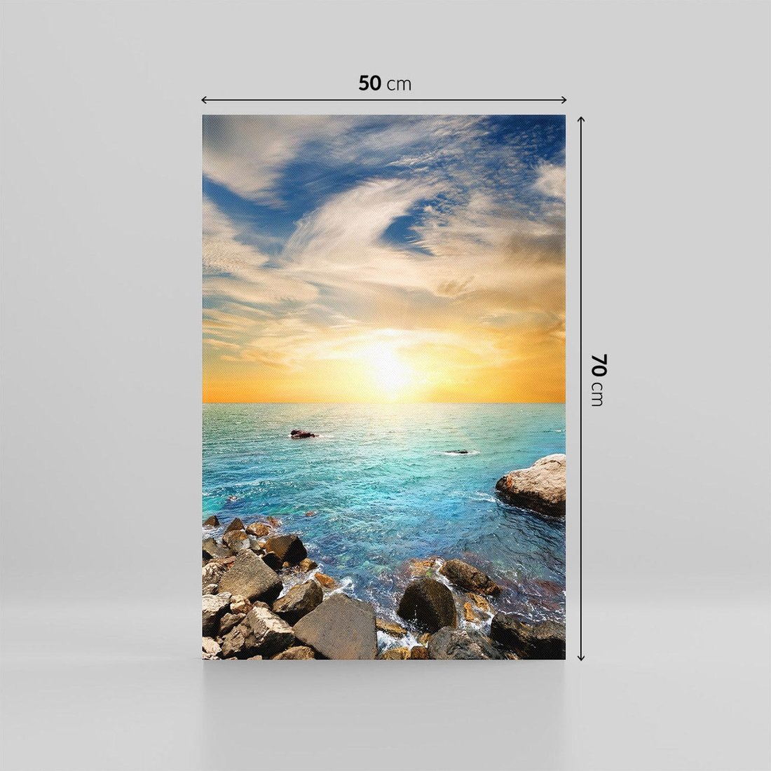Ten malowniczy obraz na płótnie przeniesie Cię na romantyczny zachód słońca na plaży. Jego ciepłe kolory, złote promienie i spokojna atmosfera dodadzą uroku i relaksu do Twojego wnętrza. Odczuj magię chwili i piękno natury w swoim domu.