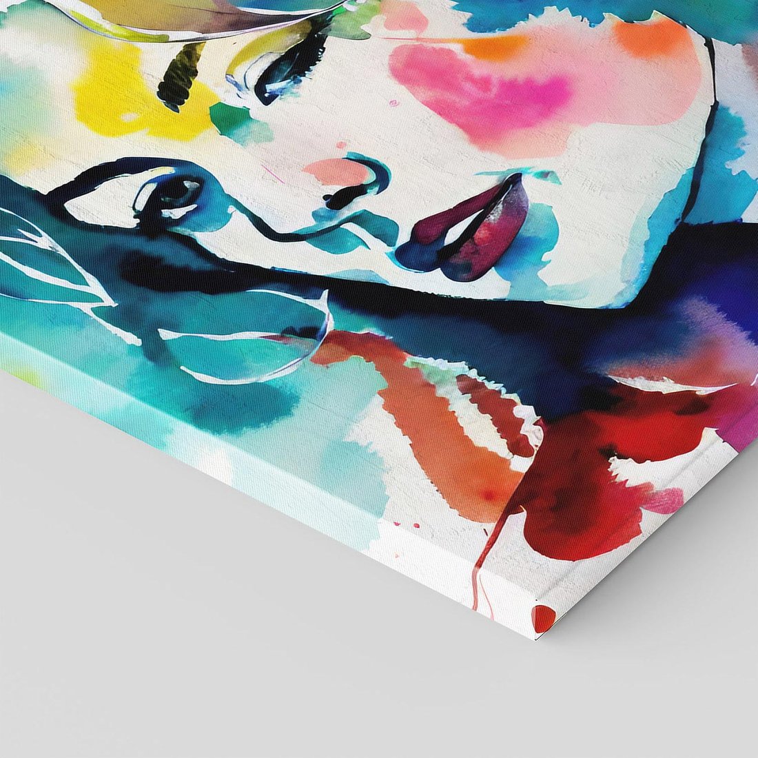 Czarna kreska w abstrakcyjnym portrecie kobiety jest delikatną osią, która kontrastuje z ekspresyjnymi akwarelowymi plamami rozpryśniętymi na płótnie. To zmysłowe połączenie wydobywa osobowość i emocje postaci , tworząc fascynujący taniec formy i koloru.