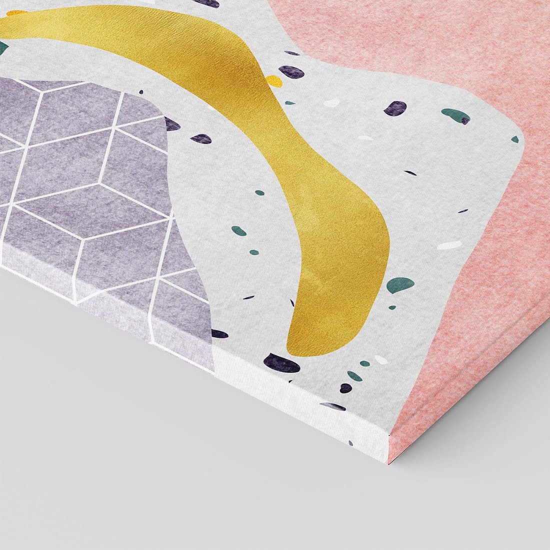 Ten kolaż tekstur łączy pastelowe abstrakcyjne plamy z elementami lastryko, tworząc mistyczną atmosferę. Przenosi nas w abstrakcyjny świat, w którym różne tekstury i kształty oplatają się, pozwalając nam zanurzyć się w niepowtarzalnej podróży przez nieodkryte przestrzenie wyobraźni.