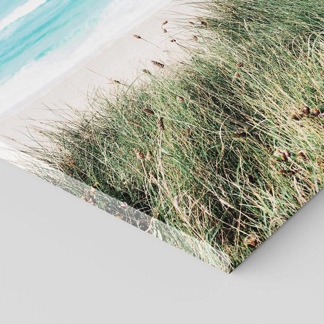 Zanurz się w spokojnej harmonii natury na tym pięknym obrazie. Wydmy porośnięte trawami stanowią malowniczy punkt odniesienia dla turkusowego morza i piaszczystej plaży. To zapierający dech w piersiach widok, który przenosi Cię w bezkresne przestrzenie natury. Doskonały wybór dla miłośników wakacji, którzy pragną zachwycić się pięknem nadmorskich krajobrazów.