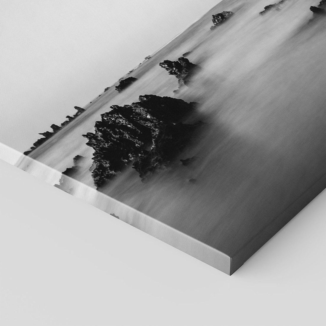 Ta czarno-biała fotografia ukazuje dziką i tajemniczą plażę, gdzie mroczny klimat przeplata się z tajemniczą atmosferą. Skały na brzegu dodają dramatyczności, a zamglony widok dodaje aurze tajemnicy. To pejzaż, który przenosi nas w świat ukrytych historii i nieodkrytych sekretów natury, zapraszając nas do kontemplacji i marzeń.