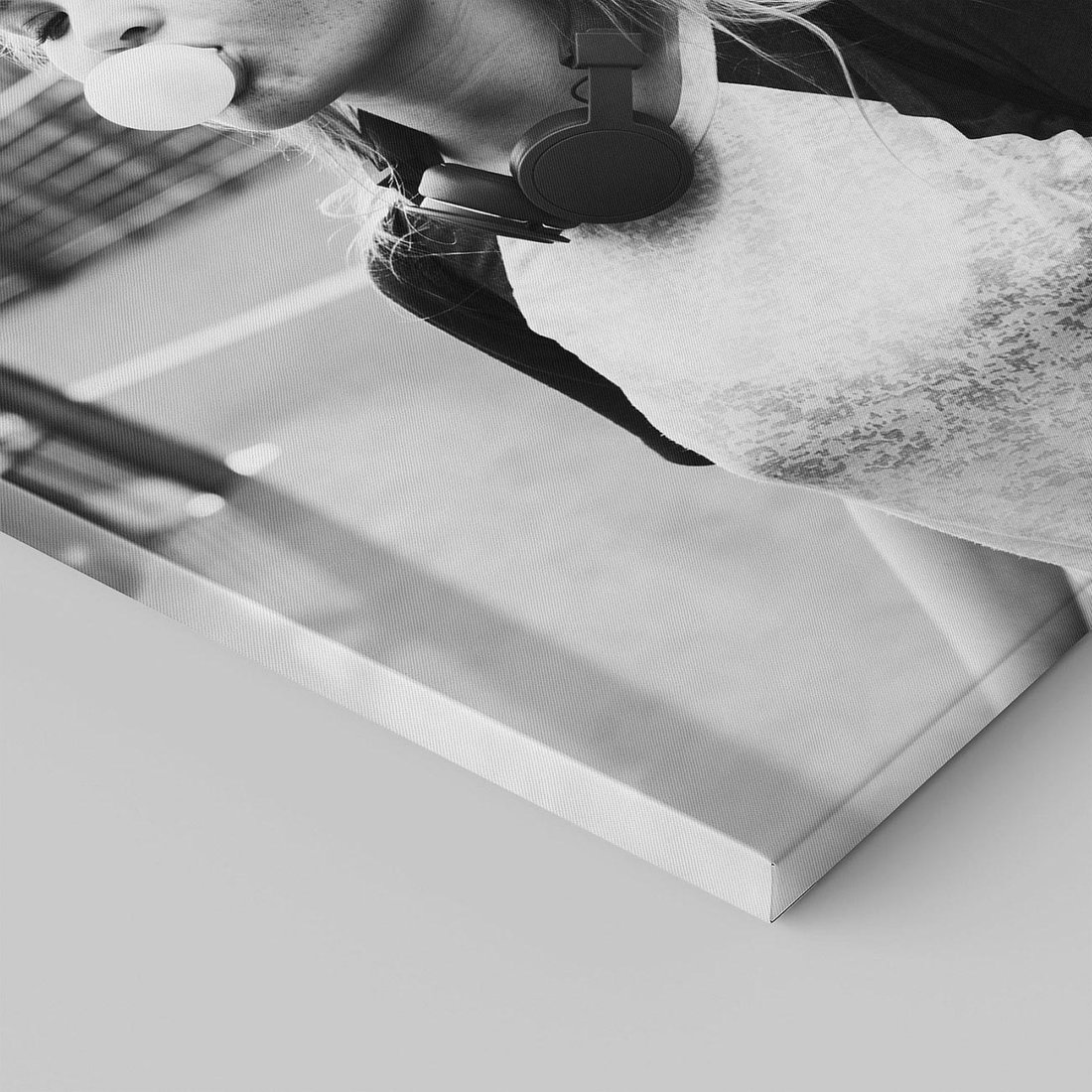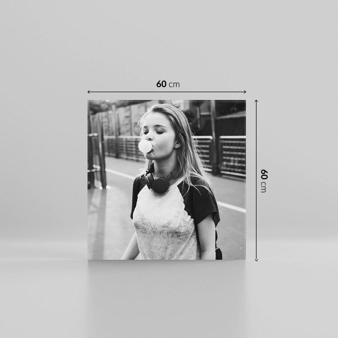 To nowoczesne czarno-białe zdjęcie przedstawia młodą dziewczynę w trakcie zabawy, gdzie robi balony z gumy. Zdjęcie ukazuje radość i beztroską chwilę młodości. Czarno-biała paleta kolorów dodaje zdjęciu elegancji i klasycznego wyglądu, a jednocześnie uchwyciła chwilę współczesności. To idealna fotografia do nowoczesnych wnętrz, które doceniają wyrażenie młodzieńczej radości i spontaniczności.