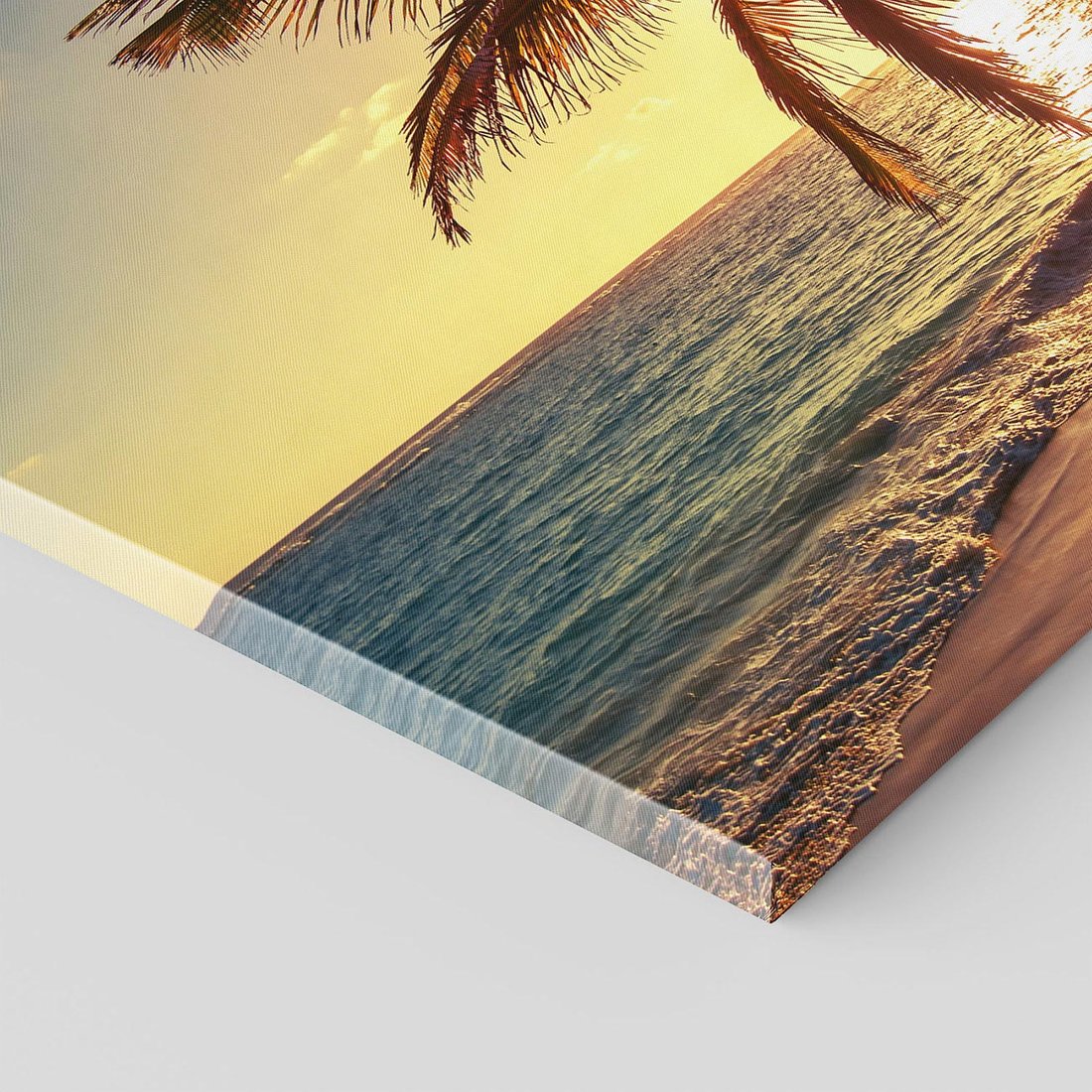 Przenieś się w magiczne chwile zachodu słońca na tropikalnej plaży dzięki temu malowniczemu obrazowi. Ciepłe kolory, palmowe drzewa i błyszczące morze tworzą romantyczną atmosferę. Ta kompozycja dodaje błogości i egzotycznego klimatu, idealna dla osób pragnących przenieść się w magiczne chwile i oddać się pięknu tropikalnej przyrody.