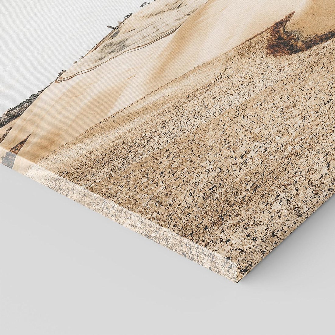 Ta fotografia ukazuje pustynny krajobraz w odcieniach sepii, gdzie wiodąca w głąb ścieżka prowadzi ku horyzontowi. To wędrówka przez niezmierzone przestrzenie, gdzie piasek i niebo zlewają się w harmonii. To zaproszenie do odkrycia tajemniczego piękna i spokoju pustynnej równiny.