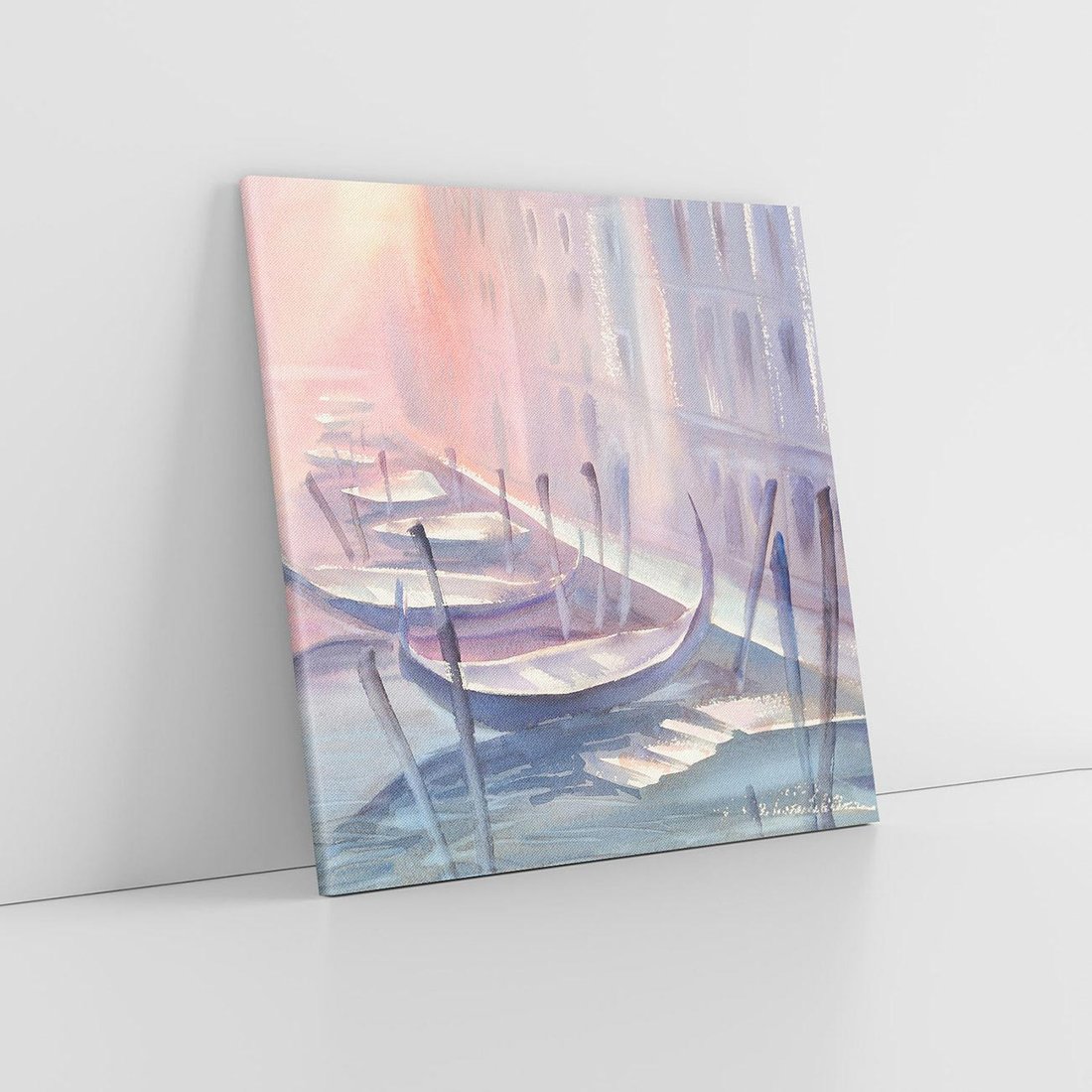 Ten akwarelowy rysunek przedstawia malownicze gondole na tle weneckiego kanału podczas zachodu słońca. Stonowane pastelowe kolory tworzą romantyczną aurę, podkreślając urok i magię Wenecji. To wizja spokoju i piękna, która przenosi nas w magiczny świat włoskiej laguny i zaprasza do kontemplacji nad pięknem przyrody i architektury.