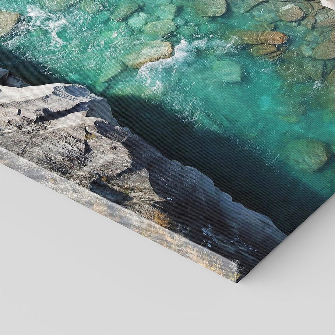 Przenieś się w malowniczy krajobraz rzeki przepływającej wśród skalistych klifów na obrazie. Poczuj energię i siłę przyrody, obserwując tę dynamiczną scenę.