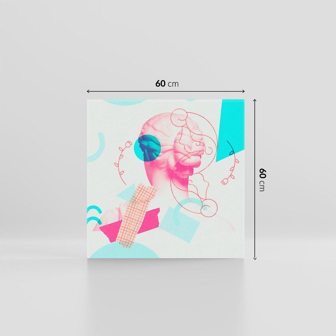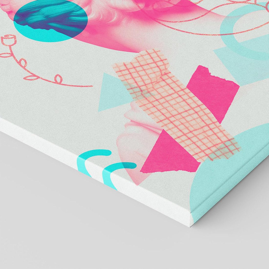 Ten nowoczesny kolaż łączy antyczną rzeźbę kobiety z elementami sztuki współczesnej. W delikatnych odcieniach różowego ukazuje piękno ludzkiej formy, przenosząc je w nowoczesny kontekst. To unikalne dzieło sztuki przyciąga wzrok i inspiruje do refleksji nad pięknem i ewolucją sztuki przez wieki.