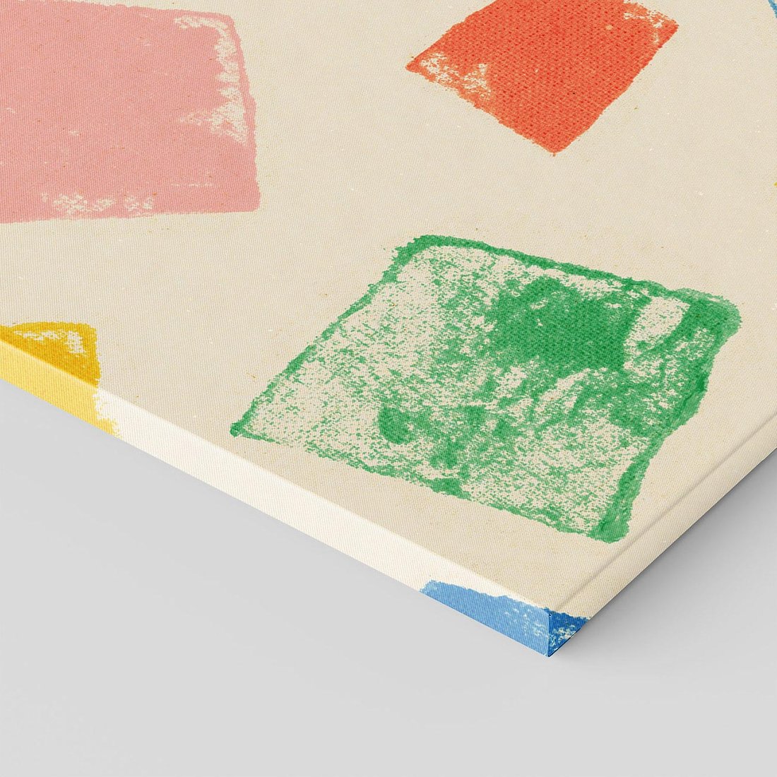 Ten wesoły kolaż to dynamiczna kompozycja kolorowych tęczowych kwadratów, które tworzą energetyczną harmonię. Wyraziste stemple dodają charakteru temu dziełu sztuki, które w pełni emanuje radością i pozytywnym wydźwiękiem.