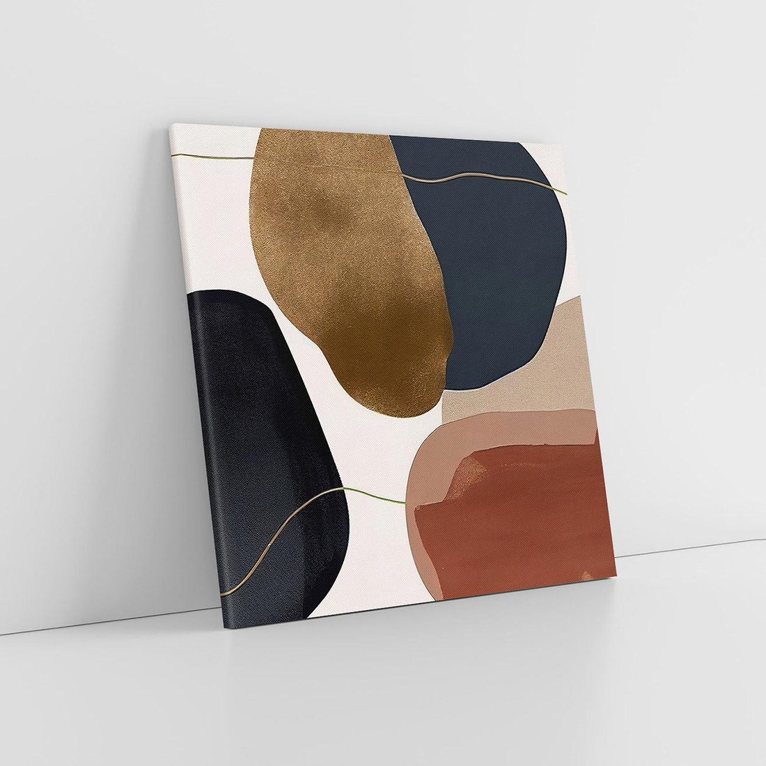 Odkryj abstrakcyjny obraz z nieregularnymi plamami w czarnym, złotym i brązowym na beżowym tle. Złote linie kreski dodają elegancji. Dla miłośników sztuki poszukujących wyjątkowych dzieł do nowoczesnych i klasycznych wnętrz.