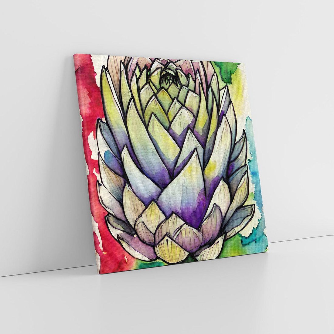Ten abstrakcyjny obraz akwarelowy ukazuje karczocha w niezwykły i artystyczny sposób. Artysta użył delikatnej techniki akwareli, aby stworzyć kompozycję, która eksperymentuje z formą i kolorem tego egzotycznego warzywa. Barwy i tekstury na obrazie są swobodne, pełne przejść, tworząc wrażenie płynności i lekkości.