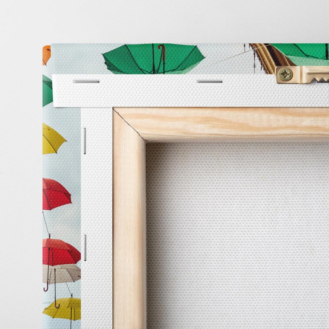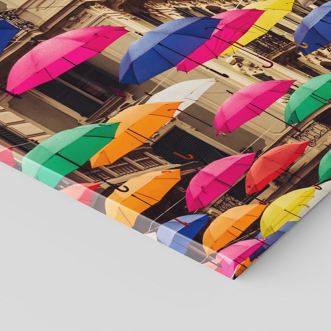 Fotografia ukazująca radosną scenę ulicy, gdzie kolorowe parasolki unoszą się nad głowami przechodniów. Ta tęczowa eksplozja kolorów tworzy niezapomnianą atmosferę, wprowadzając radość i życie do Twojego wnętrza. Te zatrzymane w kadrze chwile przypomną Ci o urokach codziennego życia.