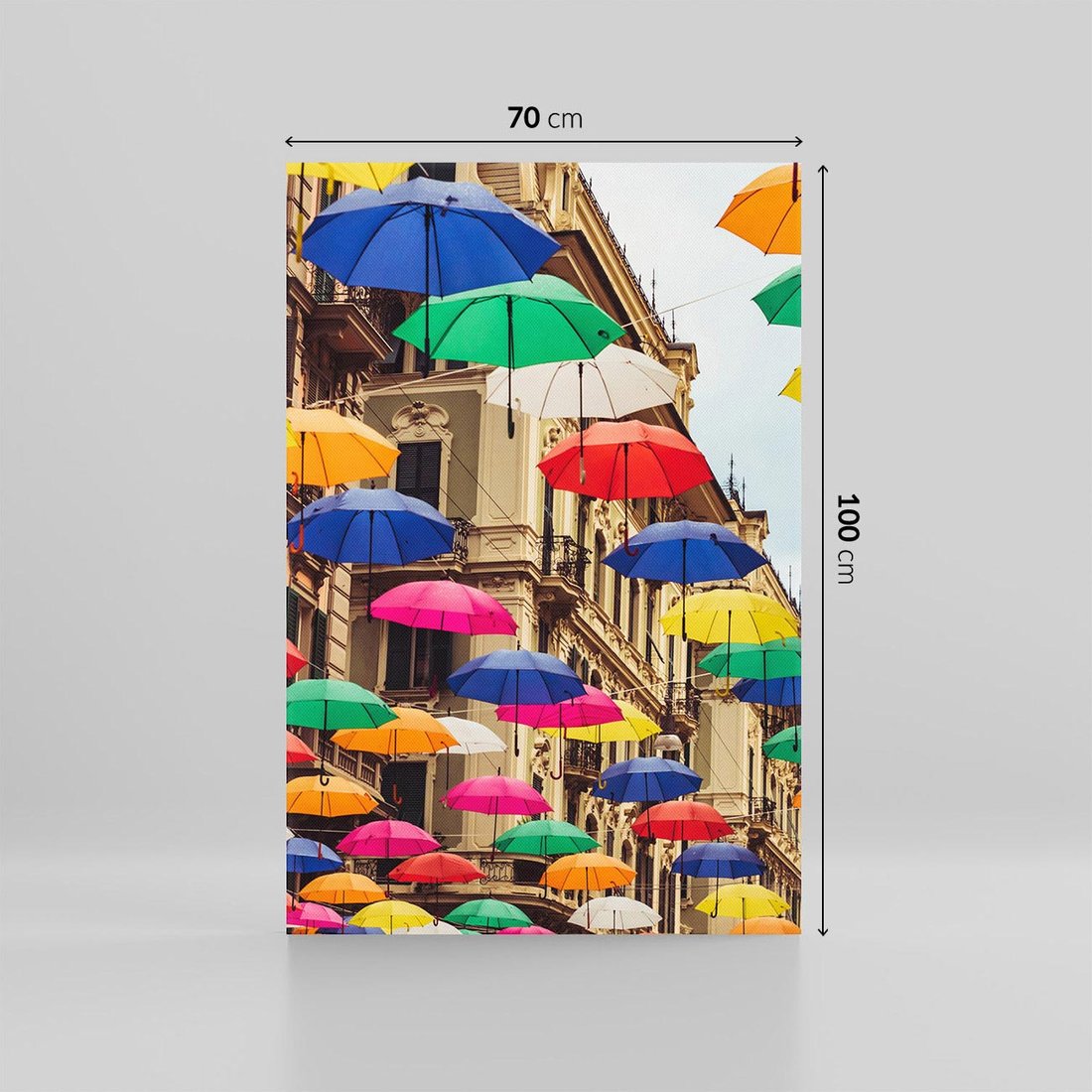 Obraz na płótnie 70x100 - Barwna symfonia wyobraźni - fotografia, kolorowe parasolki podwieszone nad ulicą
