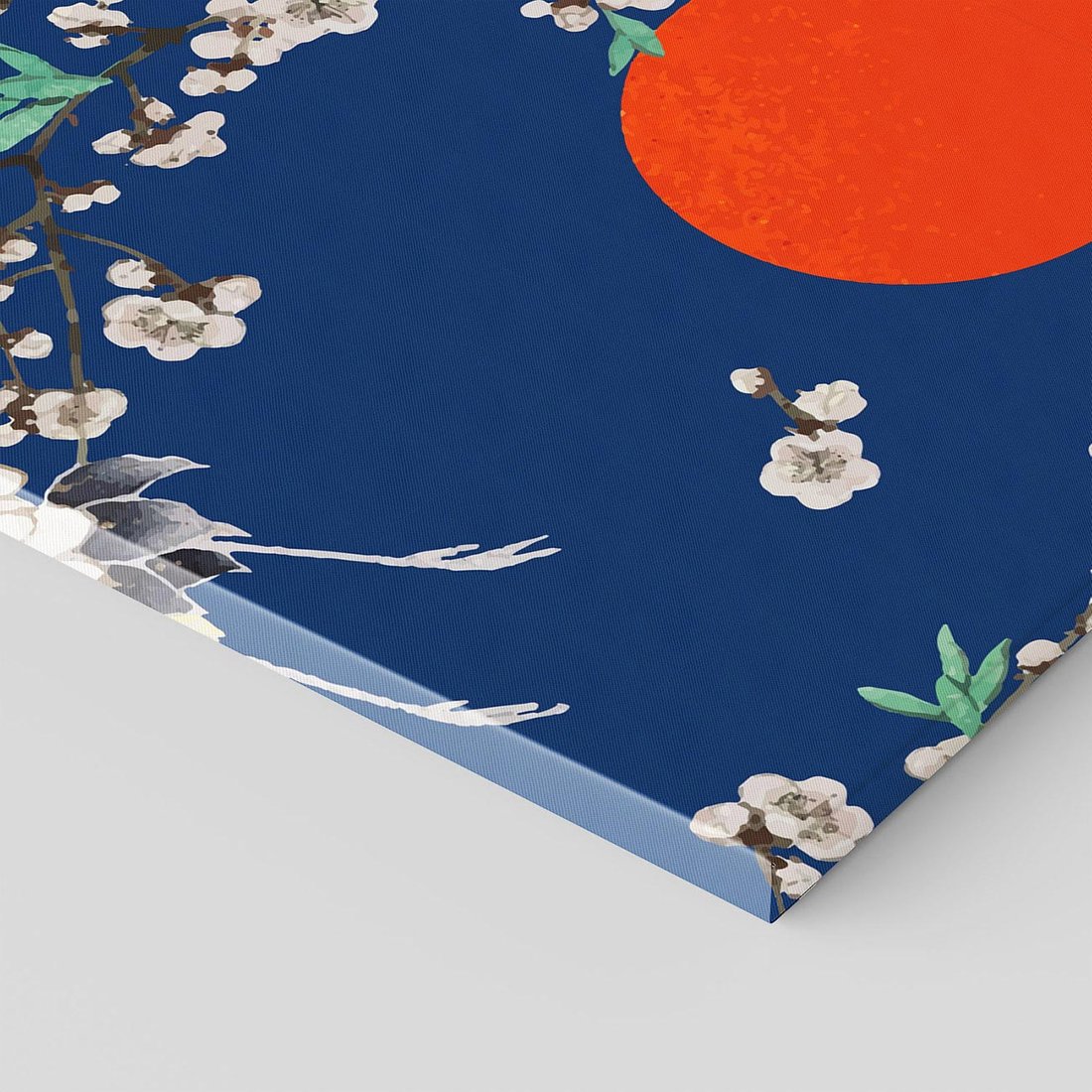 Ten obraz przedstawia japońskie żurawie na tle indygo z delikatnymi kwiatami wiśni. Czerwone akcenty dodają dynamiki i głębi kompozycji. Sztuka japońska emanuje harmonią i elegancją, a motyw żurawi symbolizuje długowieczność i szczęście. To wyjątkowe dzieło sztuki przeniesie przestrzeń w magiczny świat Japonii i subtelnej poezji.