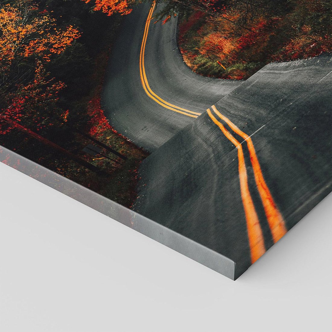 Ta fotografía uchwyciła piękno jesieni, gdzie droga asfaltowa prowadzi przez las, a drzewa mają pomarańczowe liście. Widok pomarańczowych liści drzew tworzy piękny kontrast z drogą i otaczającą przyrodą. Jest to typowy pejzaż jesieni, który oddaje urok i kolorystykę tego sezonu. To zdjęcie może stanowić wspaniałą dekorację dla tych, którzy cenią sobie urok jesieni i chcą wprowadzić go do swojego otoczenia, przypominając o pięknie zmieniającej się przyrody.