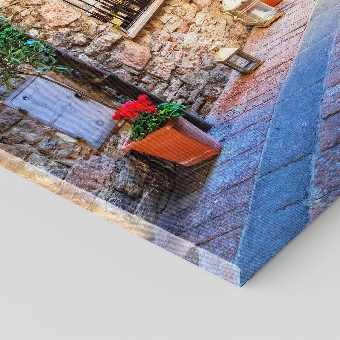 Przenieś się do urokliwego włoskiego miasta dzięki temu obrazowi przedstawiającemu malowniczą uliczkę z kaskadą kwiatów. Kolorowe fasady, kamienne uliczki i bujna roślinność tworzą niepowtarzalną atmosferę. Ten obraz dodaje włoskiego uroku i romantycznego nastroju, idealny dla miłośników podróży i piękna kwiatów.