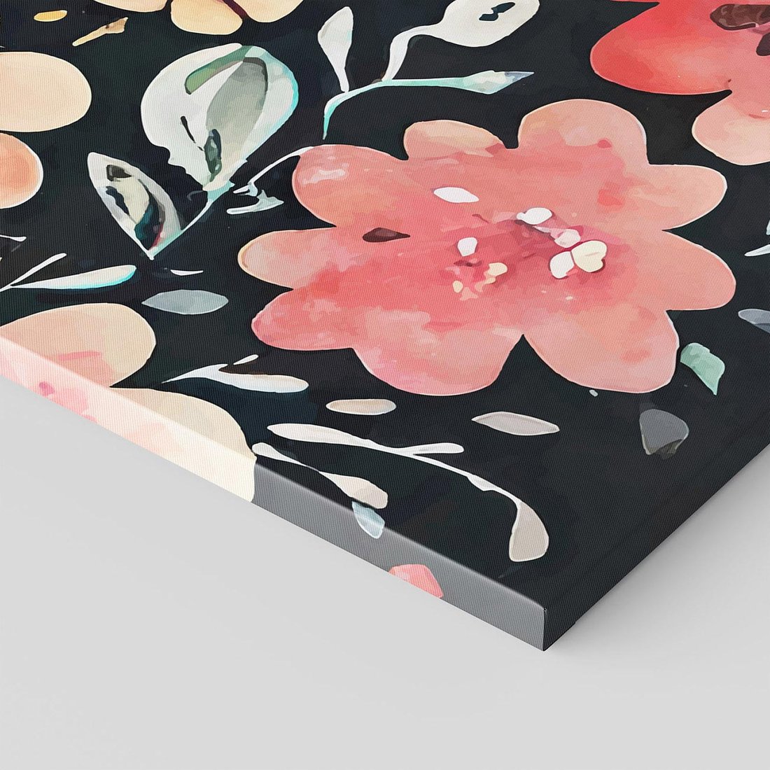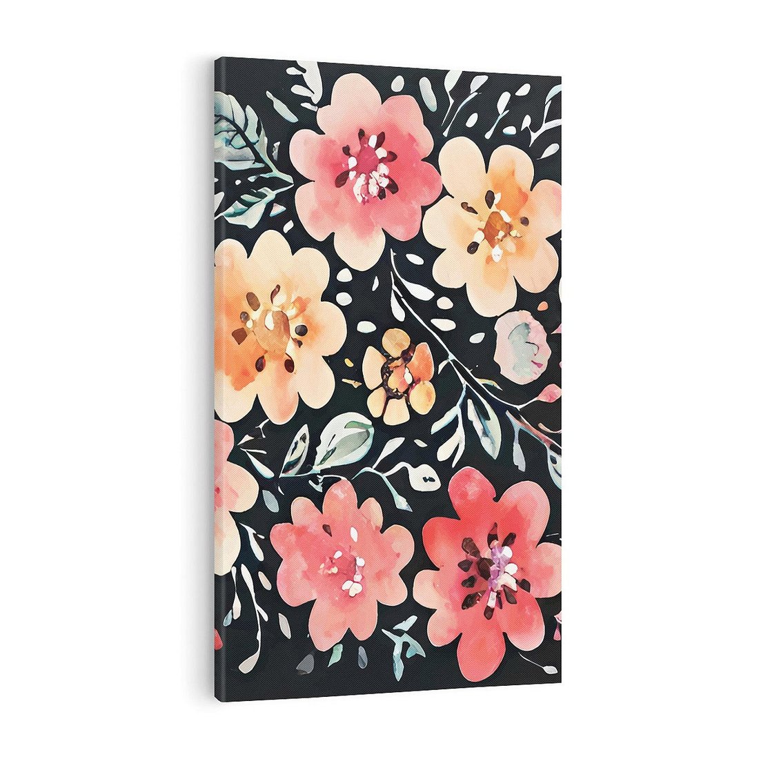 Ten obraz przedstawia akwarelowe, pastelowe kwiaty, które ożywają na tle głębokiej czerni. Kontrast między jasnymi, delikatnymi kolorami kwiatów a ciemnym tłem tworzy efektowne wrażenie. To połączenie subtelnego piękna kwiatów z tajemniczym i intrygującym tłem tworzy niezwykłą atmosferę.
