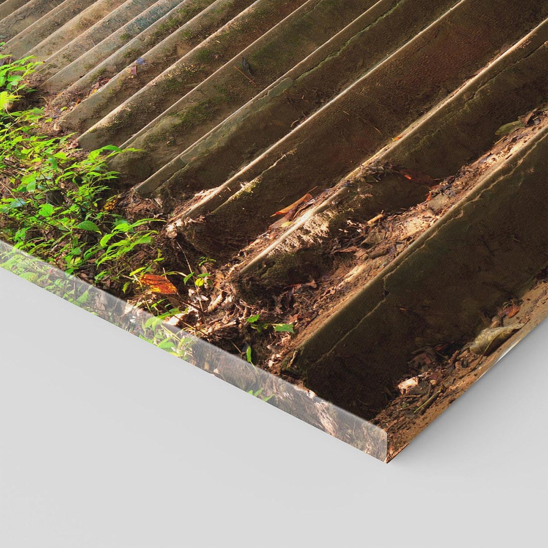 Przenieś się w malowniczy świat lasu dzięki temu ujmującemu obrazowi przedstawiającemu ścieżkę i schody otoczone drzewami. Złociste promienie, cień i ukryte tajemnice tworzą magiczną atmosferę. Ten obraz dodaje tajemniczości i przygody, idealny dla miłośników natury i osób pragnących przenieść się w inny świat.
