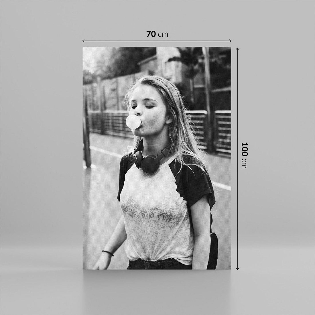 To nowoczesne czarno-białe zdjęcie przedstawia młodą dziewczynę w trakcie zabawy, gdzie robi balony z gumy. Zdjęcie ukazuje radość i beztroską chwilę młodości. Czarno-biała paleta kolorów dodaje zdjęciu elegancji i klasycznego wyglądu, a jednocześnie uchwyciła chwilę współczesności. To idealna fotografia do nowoczesnych wnętrz, które doceniają wyrażenie młodzieńczej radości i spontaniczności.