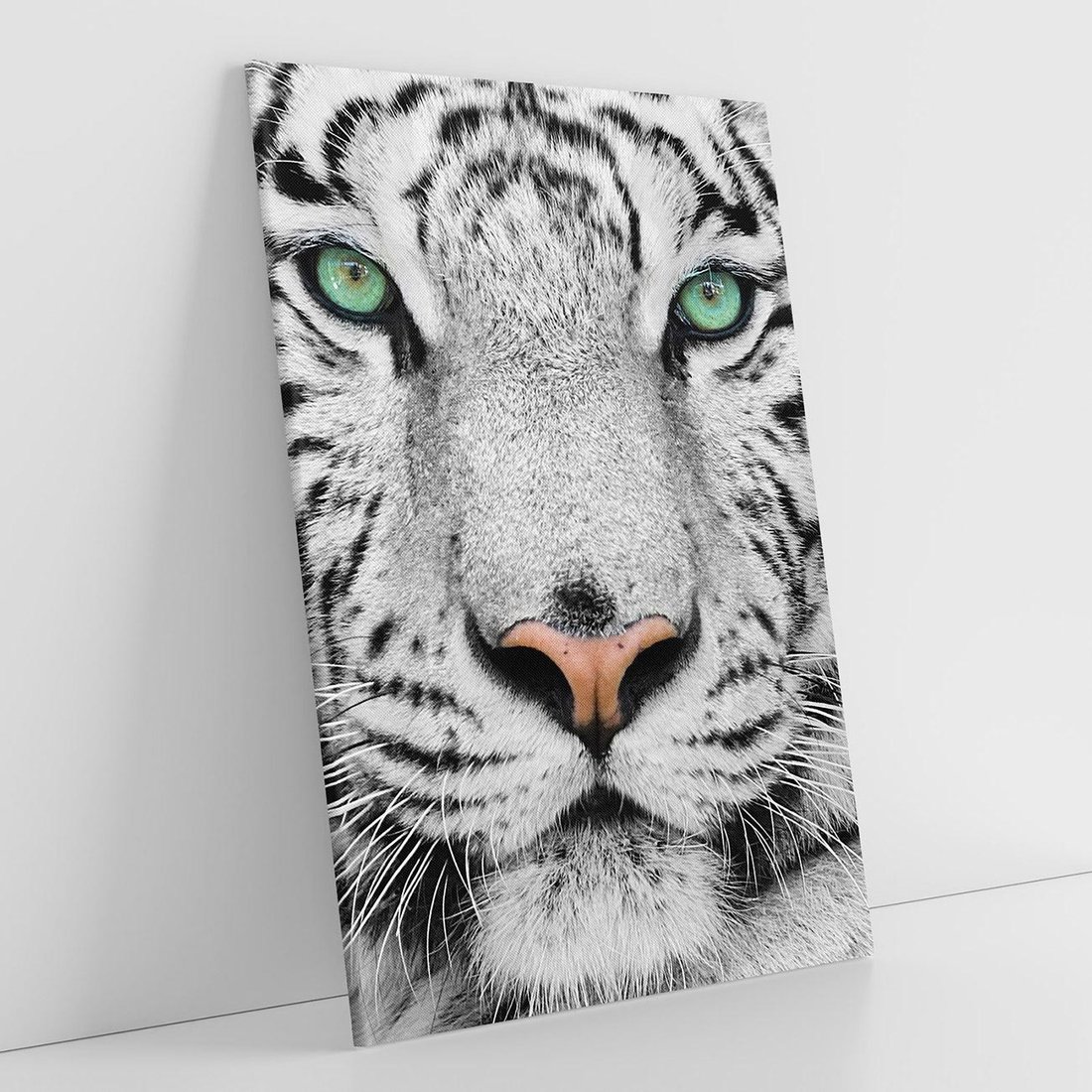 Odkryj tajemniczość i elegancję białego tygrysa na tym ujmującym obrazie. Jego majestatyczne spojrzenie i piękne futro przeniosą Cię w dziką przyrodę. Ta kompozycja dodaje egzotycznego nastroju i siły, idealna dla miłośników zwierząt i przygód.