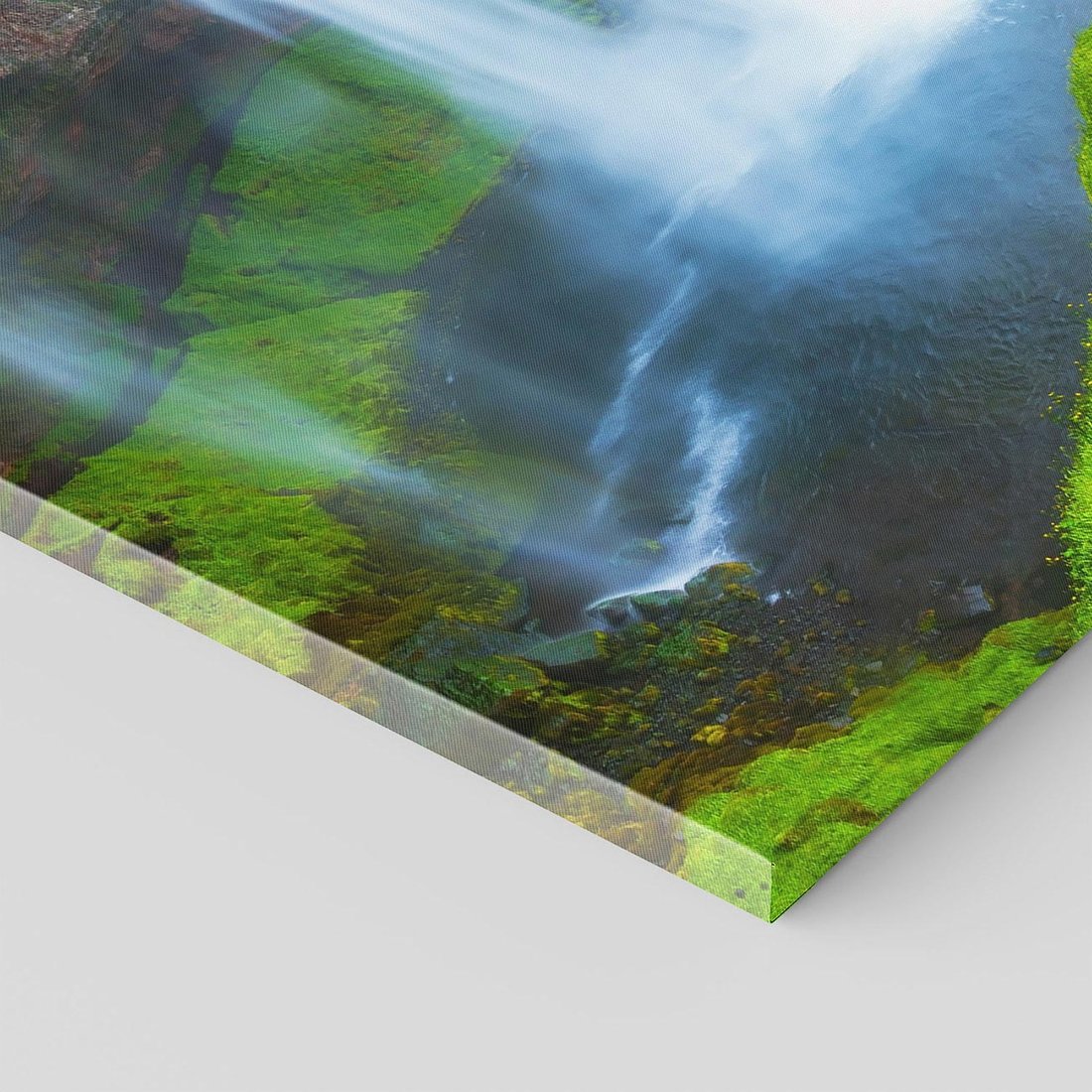 Ożyw swoje wnętrze tym imponującym obrazem przedstawiającym wodospad, góry i skały. Spadająca woda, szmaragdowa roślinność i dynamiczna atmosfera tworzą niesamowitą aurę. Ta kompozycja dodaje siły i energii, idealna dla miłośników przygody i imponujących krajobrazów.