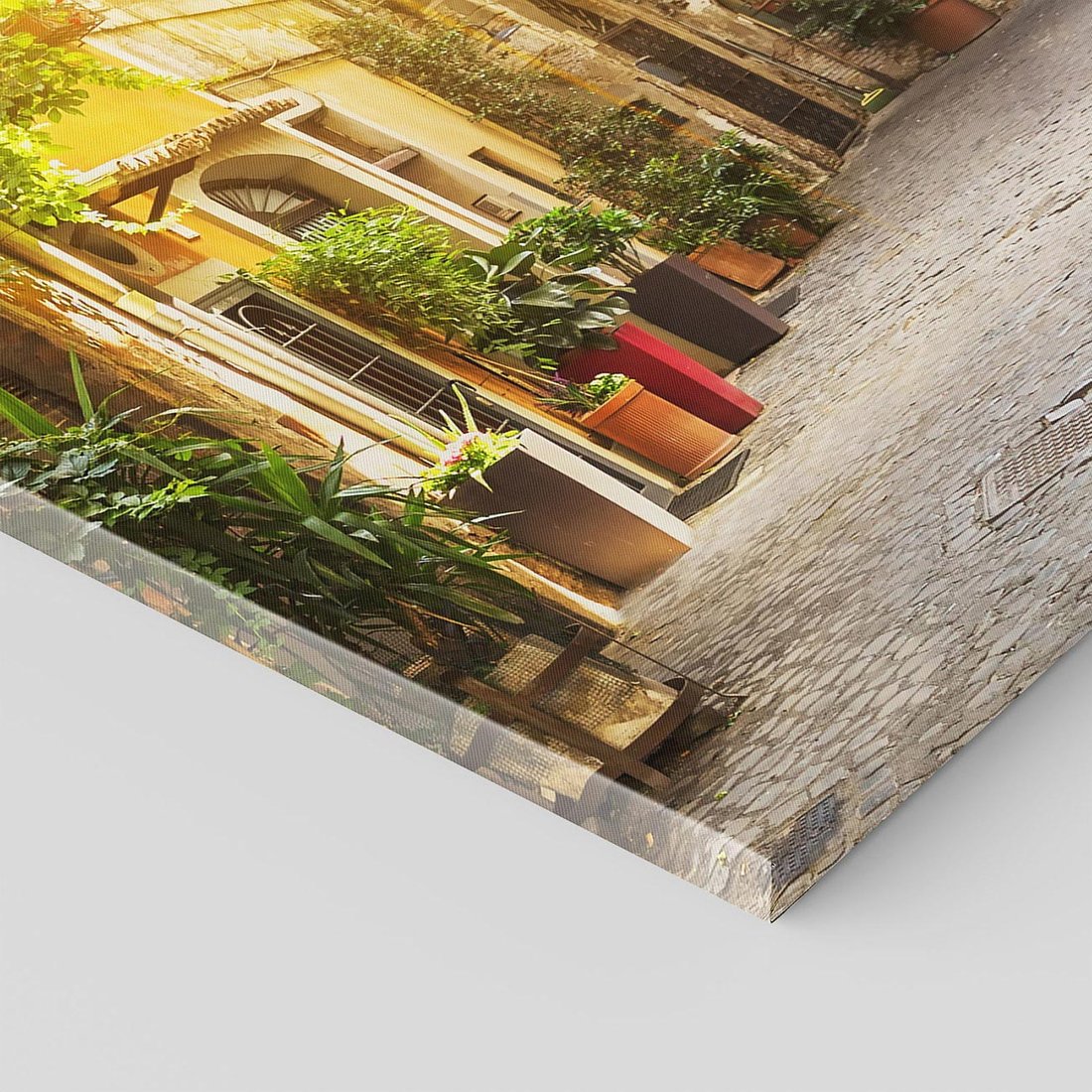 Ta urocza uliczka z głęboką perspektywą na płótnie zaprasza Cię na malowniczą wędrówkę. Odkryj urokliwe zakątki miasta i zanurz się w jego atmosferę. Dodaj uroku i atmosferycznego nastroju do swojego wnętrza.