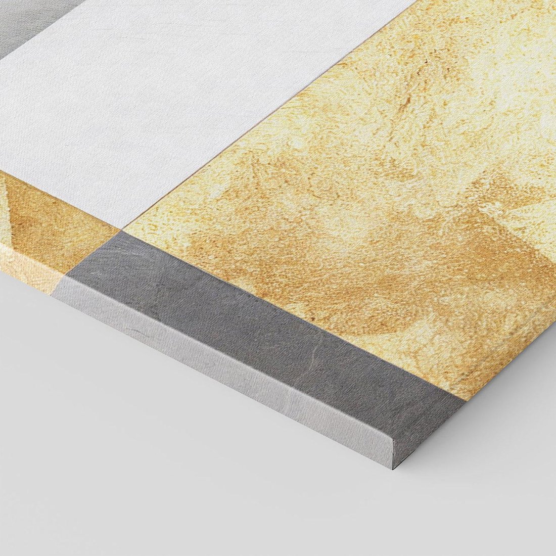 Ten abstrakcyjny obraz łączy geometryczne linie ze złotymi i szarymi blokami marmuru. Złota tekstura nadaje elegancji i nowoczesności. Szary marmur dodaje luksusowego akcentu, tworząc wyjątkowy obraz idealny do nowoczesnych pomieszczeń. To wyrafinowane połączenie abstrakcji i marmuru wzbogaci każde wnętrze.