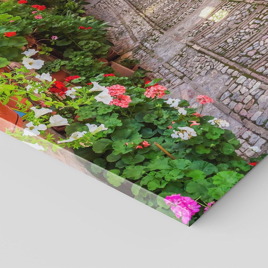 Przenieś się do magicznego miasta dzięki temu uroczemu obrazowi przedstawiającemu uliczkę wypełnioną kolorowymi kwiatami. Soczyste kolory, malownicze budynki i kwitnące rośliny tworzą atmosferę radości i uroku miejskiego krajobrazu. Ten obraz dodaje vibracji i witalności, idealny dla miłośników miejskiego stylu i natury.
