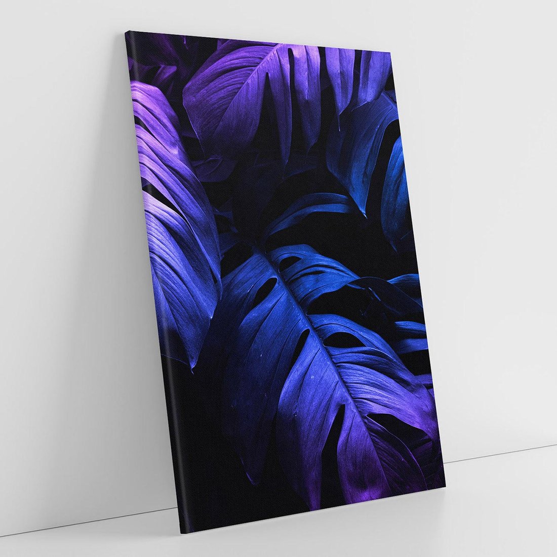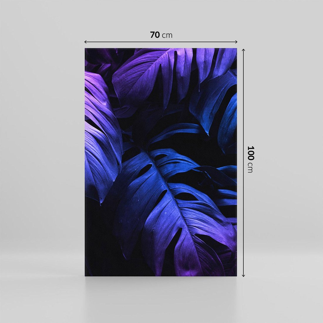 Obraz na płótnie 70x100 - Mroczna Magia Dżungli - mroczna grafika, fioletowe liście monstery na czarnym tle