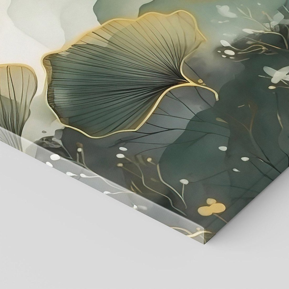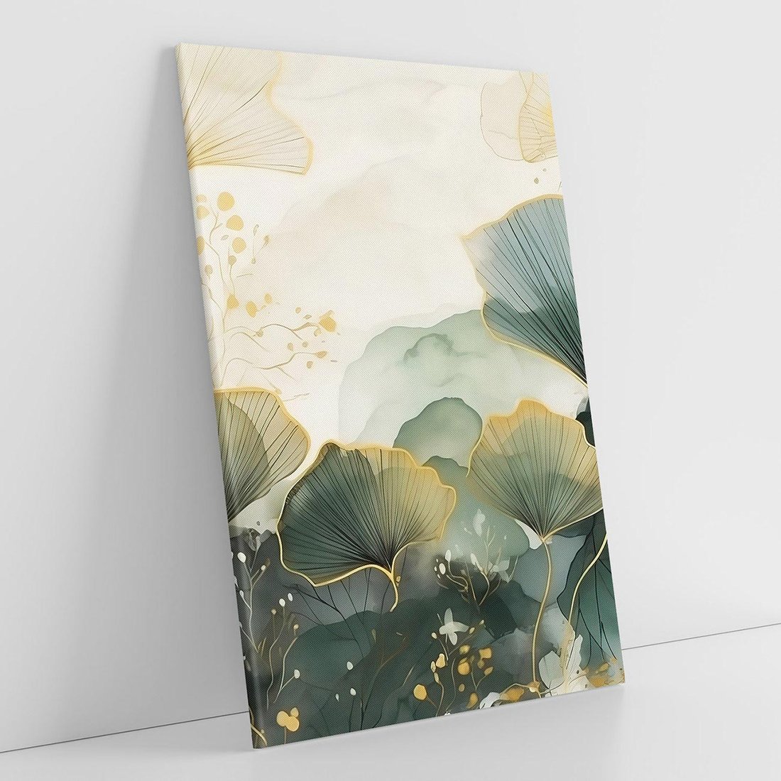 Ten malowniczy obraz przedstawia liście miłorzębu japońskiego w zgaszonej zielonej tonacji, z pięknym akwarelowym efektem. Złote elementy dodają subtelnej elegancji, nadając kompozycji wyjątkowego uroku. To artystyczne dzieło sztuki wprowadzi wspaniały akcent natury do Twojego wnętrza, zachwycając oryginalnością i delikatnością.