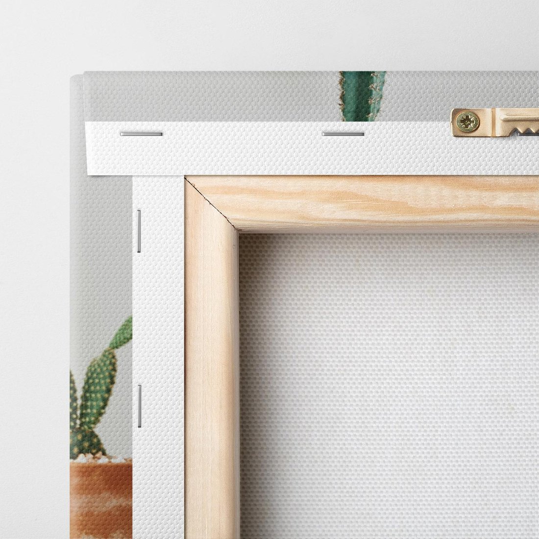 Ożyw swoje wnętrze naturalną harmonią za pomocą obrazu przedstawiającego kaktusy i liście sukulenty. Poczuj spokój i siłę natury, obserwując te wyjątkowe rośliny na tle minimalistycznej kompozycji.