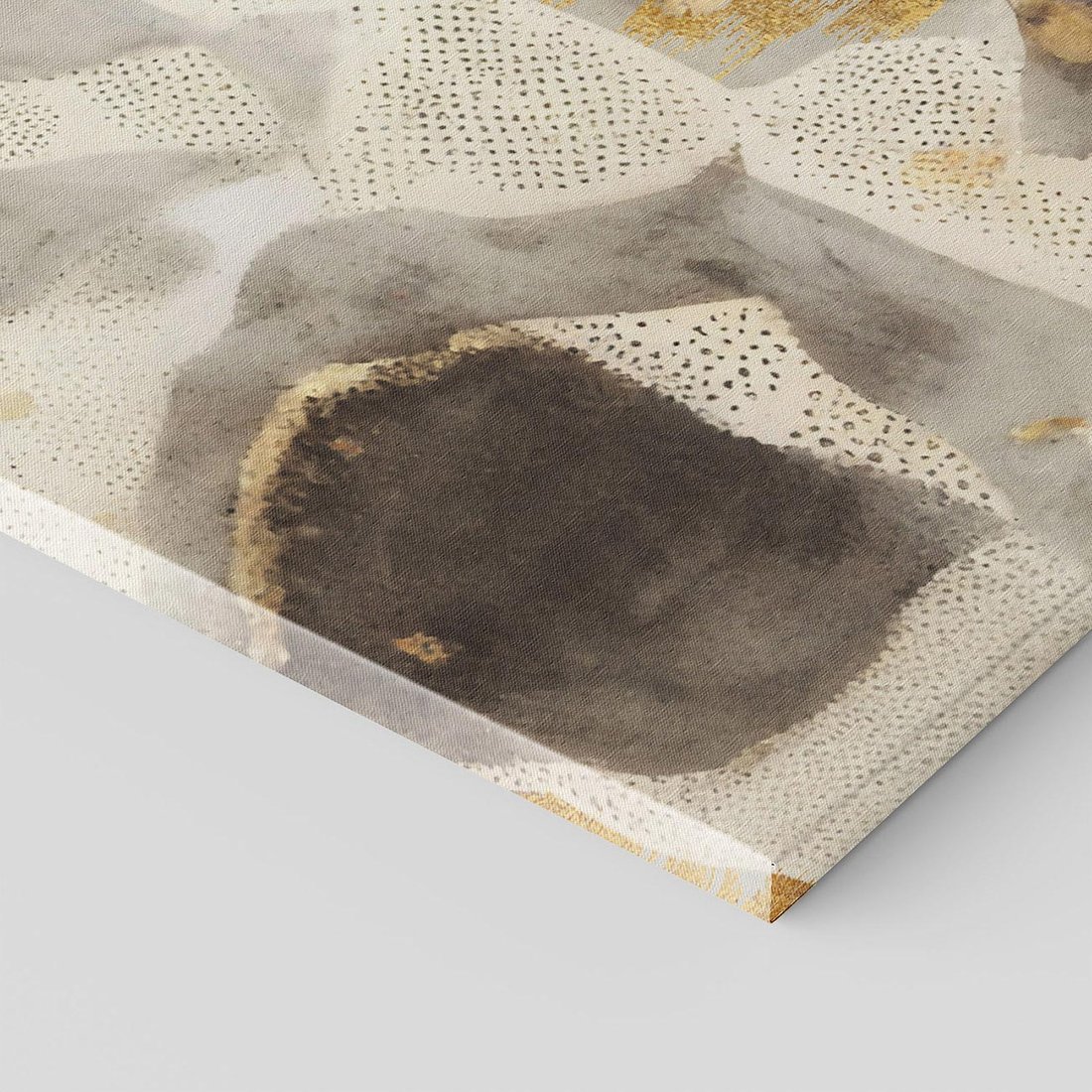 Ten nowoczesny obraz o charakterze glamour przedstawia złote i beżowe plamy, tworząc abstrakcyjne formy. Szarość dodaje elegancji i głębi kompozycji. To wyjątkowe dzieło sztuki idealnie pasuje do nowoczesnych wnętrz, nadając im subtelny luksus i artystyczną atmosferę.