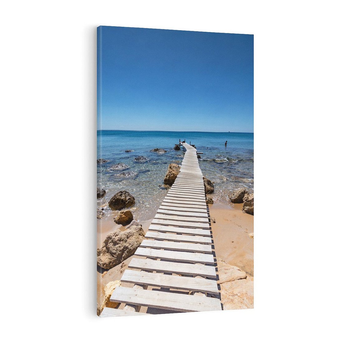 Przenieś się na spokojną plażę nad morzem dzięki obrazowi na płótnie. Odczuj relaksujący szum fal i ciepły piasek pod stopami, gdy przenosisz się na pomost, który zapewni Ci chwilę wytchnienia i ukojenia.
