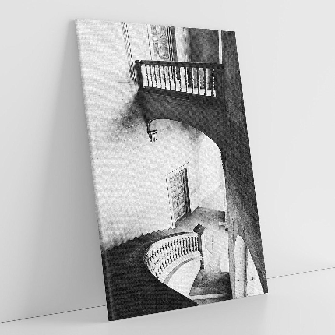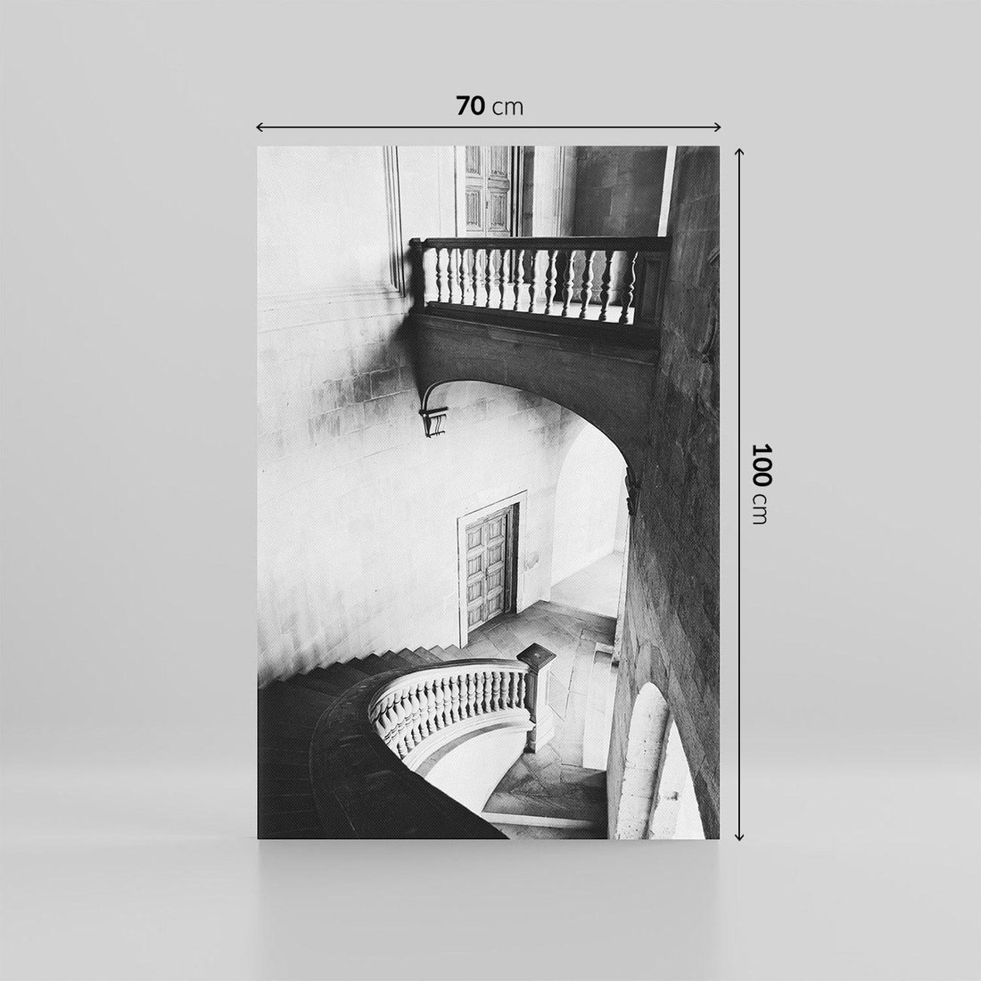 Obraz na płótnie 70x100 - Po Schodach w Dół - czarno białą fotgrafia, zakręcone schody w starek kamienicy