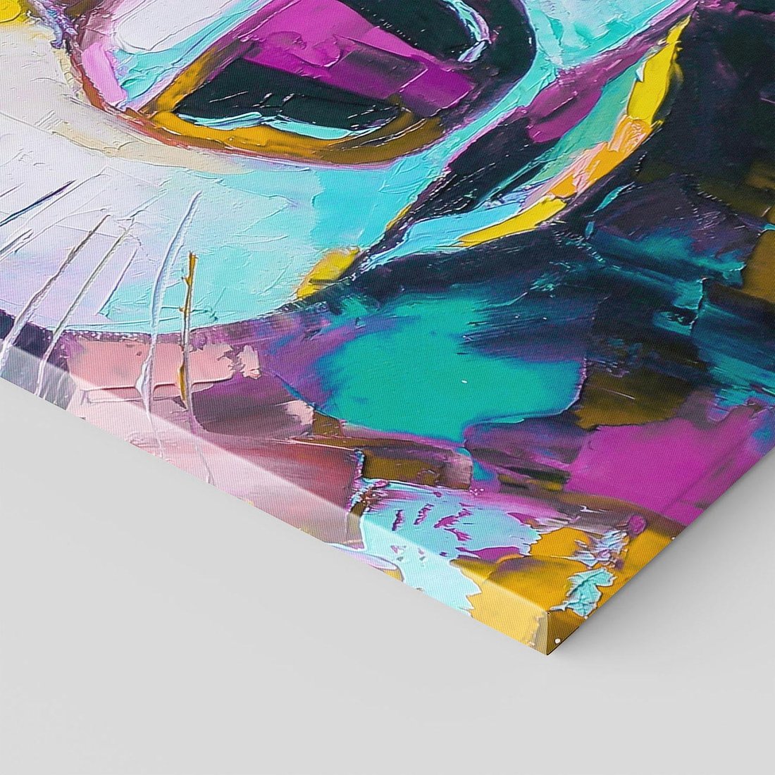Abstrakcyjne zbliżenie na portret szopa pracza ukazuje zaskakującą paletę kolorów i ruchliwą abstrakcyjną kreskę. To wyjątkowe dzieło emanuje energią i żywiołowością, przyciągając spojrzenia i dodając wyjątkowego uroku każdemu wnętrzu. Odkryj nową perspektywę natury przez soczyste i dynamiczne barwy tego obrazu.