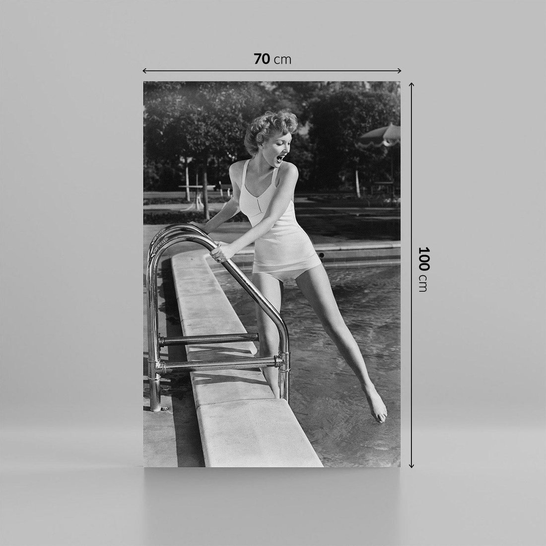 To retro zdjęcie w czerni i bieli przedstawia urok staromodnego stylu pin up. Na fotografii widoczna jest kobieta w eleganckim stroju kąpielowym wchodząca do basenu. Obraz ten przenosi nas w czasie do epoki pełnej klasy i wdzięku. Jest to doskonały wybór dla miłośników stylu retro oraz dla tych, którzy chcą dodać nutkę nostalgii i elegancji do swojego wnętrza.