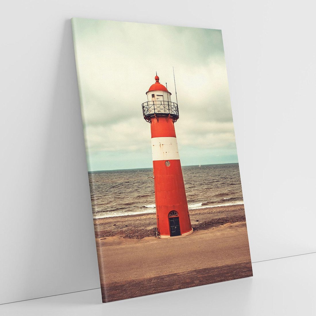 Ta urokliwa fotografia utrzymana w stylu retro przedstawia malowniczą latarnię morską w czerwono-białe pasy. Jej wyrazisty design kontrastuje z zachmurzonym niebem i morzem w tle, nadając kompozycji niepowtarzalny charakter. To klasyczne piękno nadmorskiej scenerii, które przenosi nas w czasie i dodaje nostalgii do współczesności.