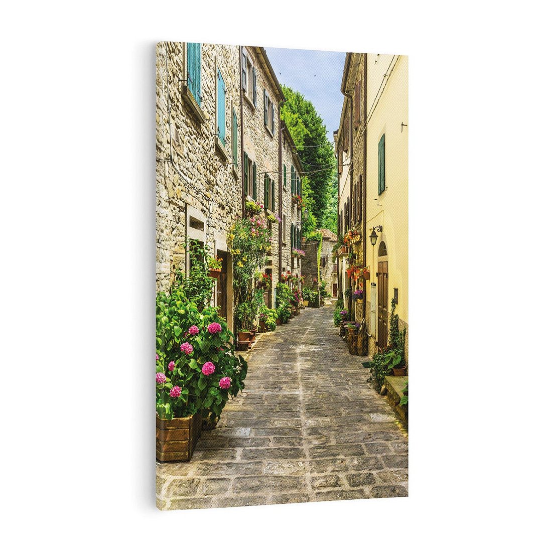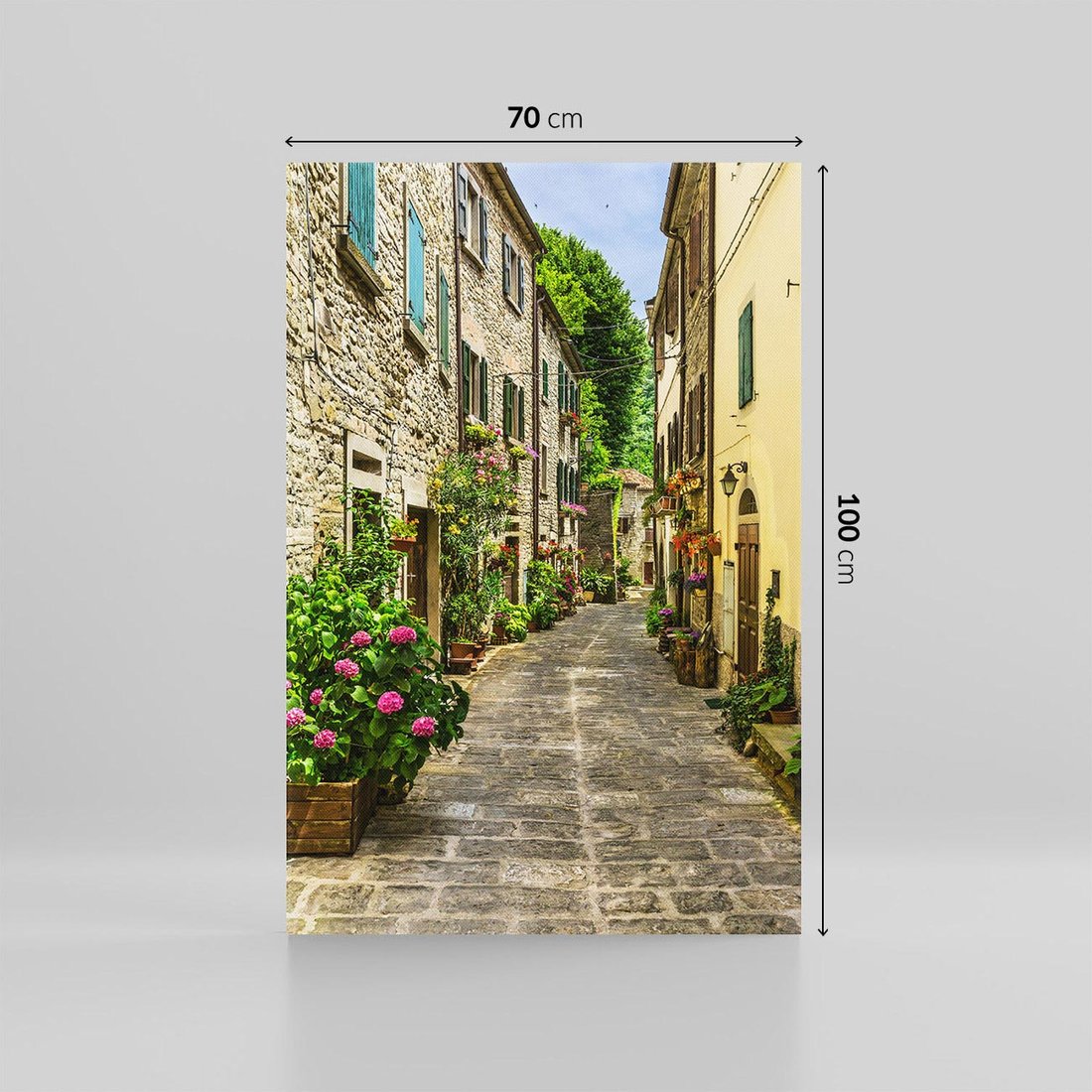 Podziwiaj magiczną uliczkę o głębokiej perspektywie na tym obrazie na płótnie. Ta realistyczna kompozycja przeniesie Cię do malowniczego miasteczka, gdzie kamienice i latarnie tworzą niezwykły widok. Pośród uliczkowego klimatu poczujesz atmosferę romantyzmu.