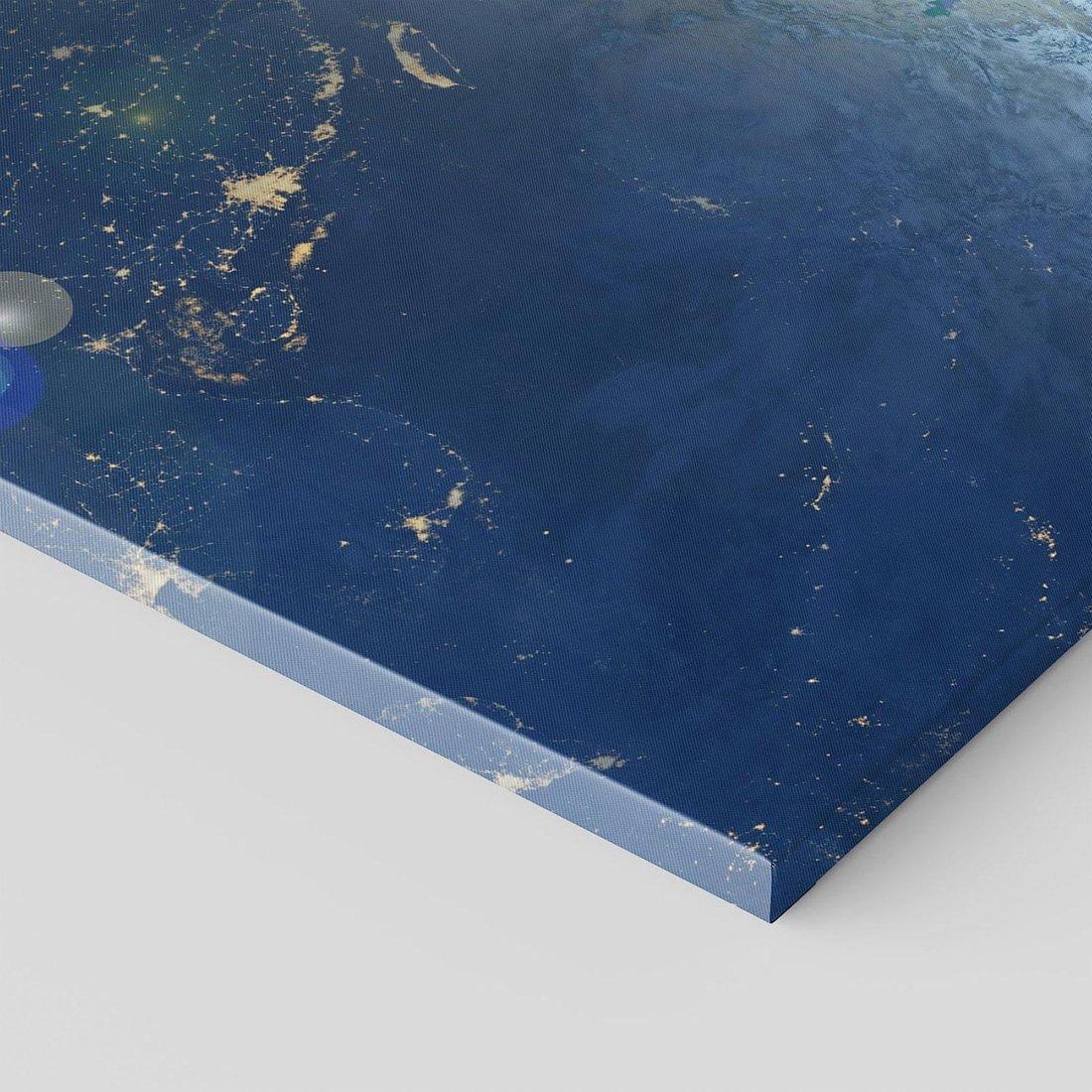 Ożyw swoje wnętrze tym obrazem przedstawiającym spotkanie księżyca i Ziemi w kosmicznej przestrzeni. Jasne promienie, barwne tło i majestatyczny księżyc tworzą niesamowitą atmosferę. Ten obraz dodaje uroku i fascynacji kosmosem, idealny dla miłośników widoków nocnego nieba i tajemniczych kosmicznych spotkań.